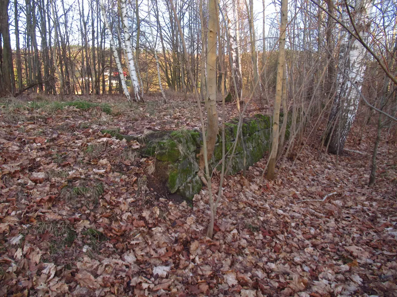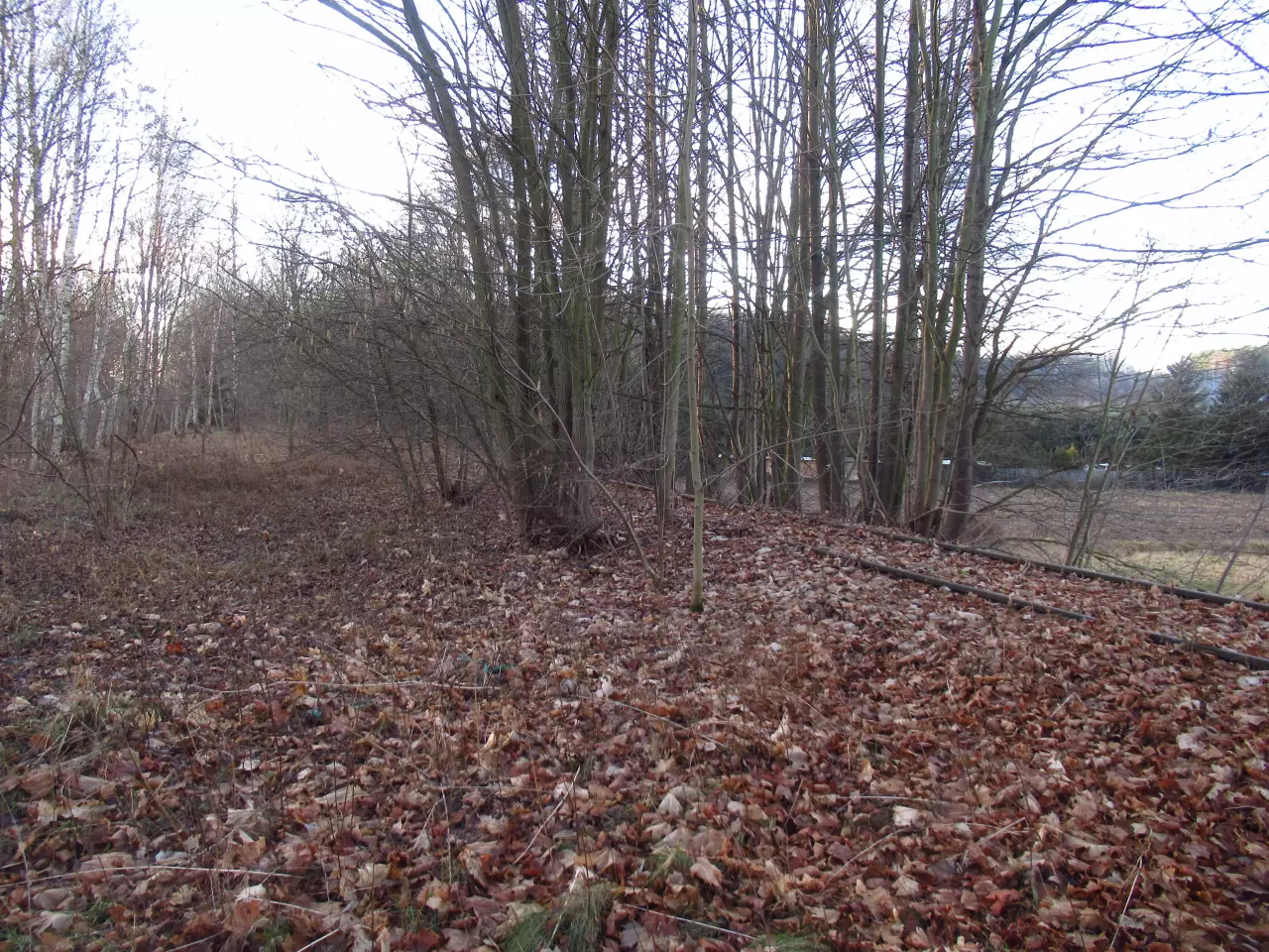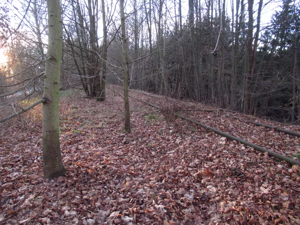 Zarośnięte pozostałości rampy przeładunkowej. Widok od strony Nowej Wsi Grodziskiej/Złotoryi, w kierunku południowo-zachodnim. Za rampą biegnie DW 364.