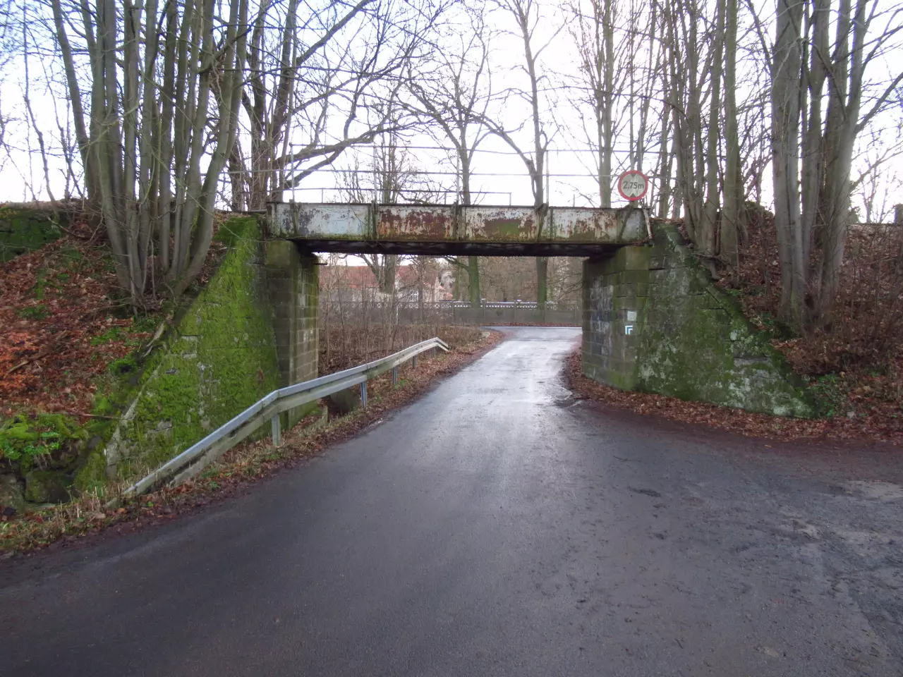Wiadukt nad ul. Malowniczą w Płakowicach, pomiędzy peronem przystanku (na wprost), a dawną ładownią. Widok w kierunku zachodnim, od strony Nowej Wsi Grodziskiej/Jerzmanic-Zdroju.