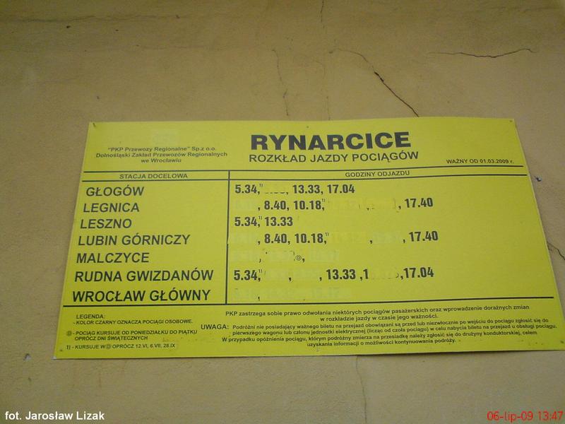 Opis ogólny: Poziom torów został podniesiony prawdopodobnie podczas elektryfikacji (wówczas mogły zniknąć także ostatnie ślady torów dodatkowych). Dzięki tym zabiegom istnieje teraz dość łagodny łuk, jednak na samym jego środku jest przejazd z sygnalizacją świetlno - dźwiękową, i punktowe ograniczenie do 40 km/h. są pewne nieścisłości co do tego przystanku, wcześniej był on stacją, wiata, która tam stoi składa się z trzech pomieszczeń, obecnie czynna jest tylko poczekalnia, pozostałe dwa (podręczny magazyn oraz pomieszczenie kasy biletowej i jednocześnie pokój dróżnika) są obecnie zamurowane w celu ochrony przed dewastacją. Wcześniej, między budynkiem stacyjnym a drogą, znajdowała się murowana wiata, która mieściła pomieszczenie na opał, oraz magazyn z narzędziami dla robotników torowych (swego czasu pamiętam, że był tam nawet wózek torowy). Oprócz tego stacyjka ta miała ładownię, do tej pory zachował się bruk, którym została utwardzona. Niestety jest on w obecnej chwili rozbierany. Dodatkowo ładownia posiadał murowaną z cegły rampę jest ona w obecnej chwili w ruinie. Z relacji mojego dziadka wynika, że jeszcze na początku lat 70-tych tor boczny (a raczej bocznica gdyż była ona połączona z torem głównym jednym rozjazdem od strony Rudnej) był czynny, ładowały się nawet wojska radzieckie na podstawione wagony. (info: Ryszard Leszczyński, 2004-10-04) Opis infrastruktury: Obecnie stacja a raczej już przystanek posiada tylko jeden tor. (info: Jarosław Lizak, 09-03-2010) Opis budynków: Mały murowany budynek stacyjny posiada już tylko poczekalnie, lecz i tak jest przeznaczony do rozbiórki. (info: Jarosław Lizak, 09-03-2010) |