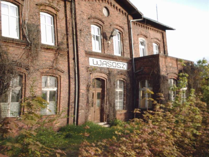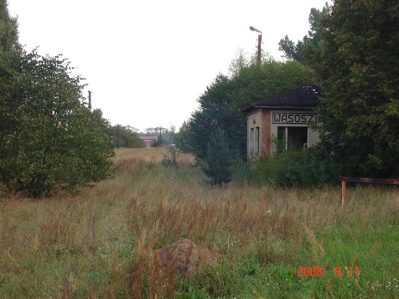 Wąsosz. Wieża wodna w lipcu 2008 r. Widok od strony torów, w kierunku południowo-zachodnim: w prawo dworzec i perony, w lewo Krzelów/Ścinawa i (dawniej) Żmigród.