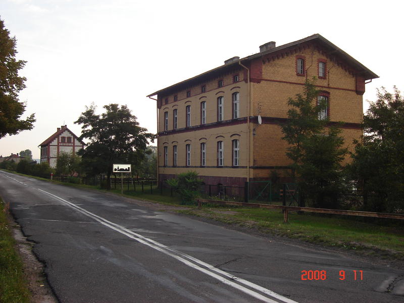 Kolejowe budynki mieszkalne stojące przy ul. Kolejowej. Na pierwszym planie pozostałości przejazdu kolejowego na wjazdach od strony Krzelowa/Ścinawy i (dawniej) Żmigrodu. Kierunek północno-wschodni.