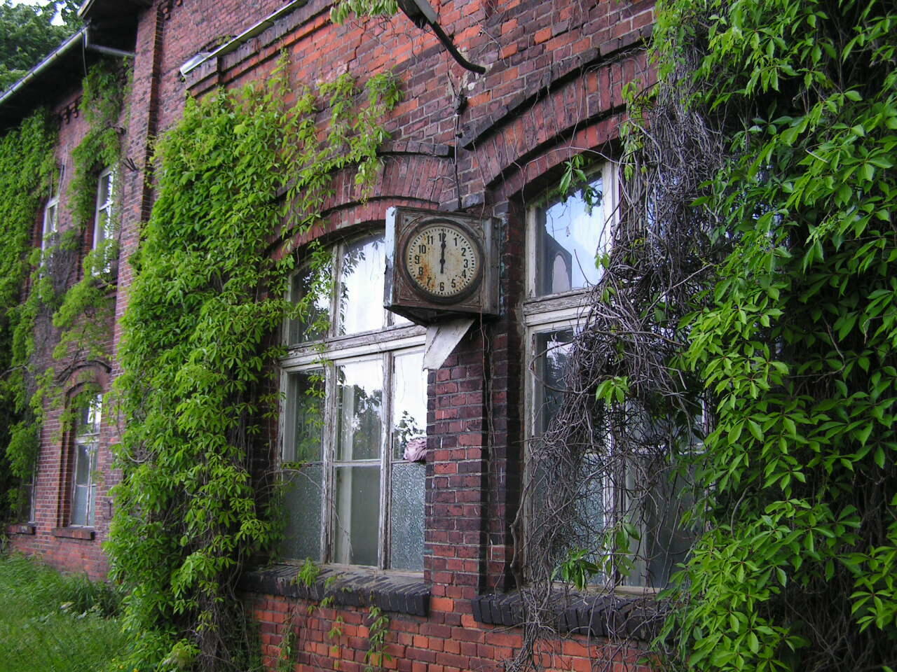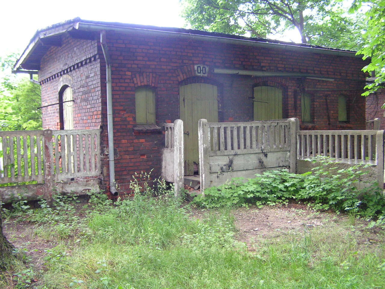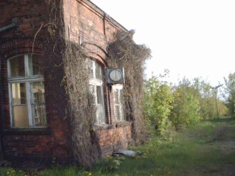 Tutaj czas dla kolei nieodwracalnie zatrzymał się. Fragment dawnego dworca. Przybudówka, w której mieściła się nastawnia dysponująca. Widok od strony peronów, w kierunku wschodnim.