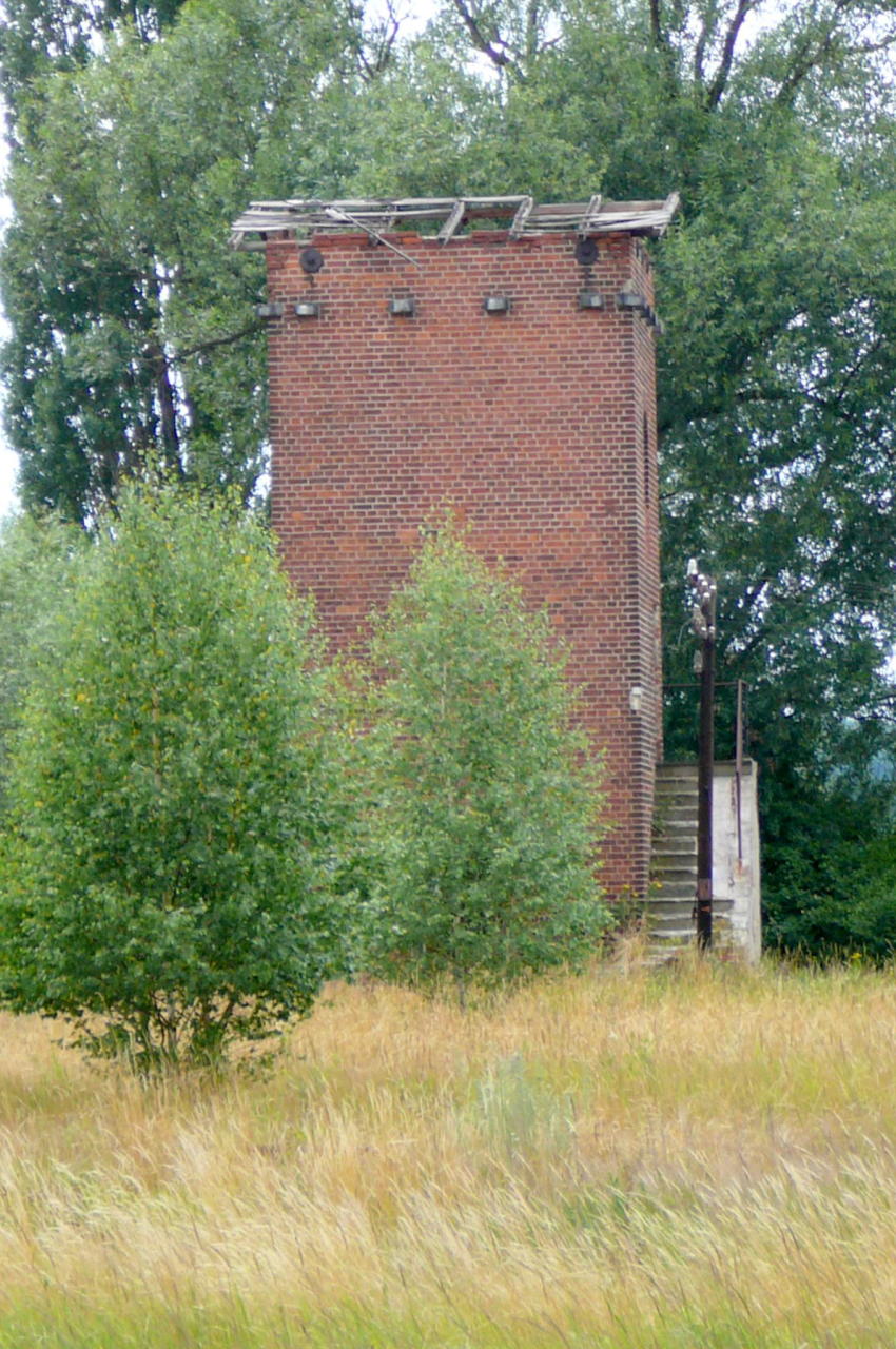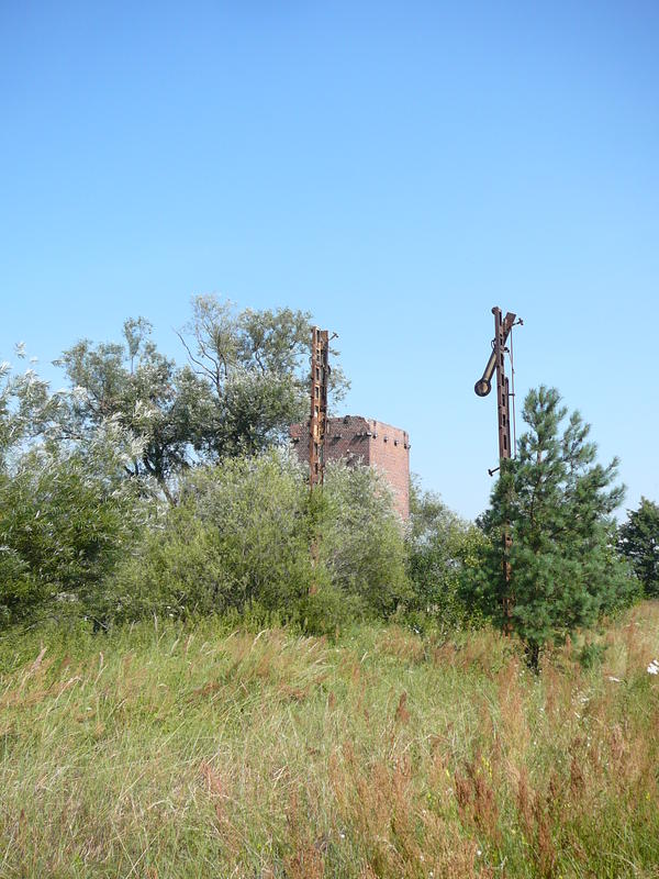 Wąsosz. Smutne towarzystwo wieża: wodna bez dachu i nieczynne semafory. Widok od strony wjazdów z Krzelowa/Ścinawy i (dawniej) Żmigrodu. Kierunek północno-zachodni.