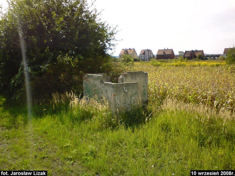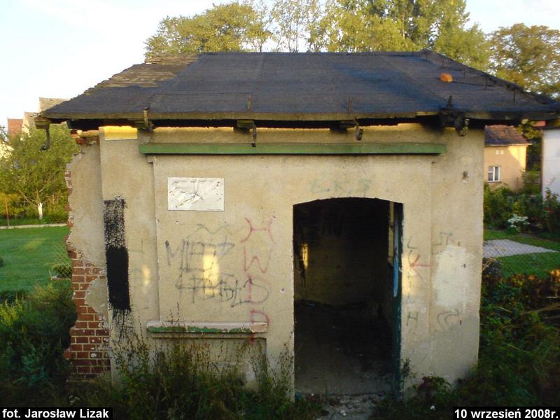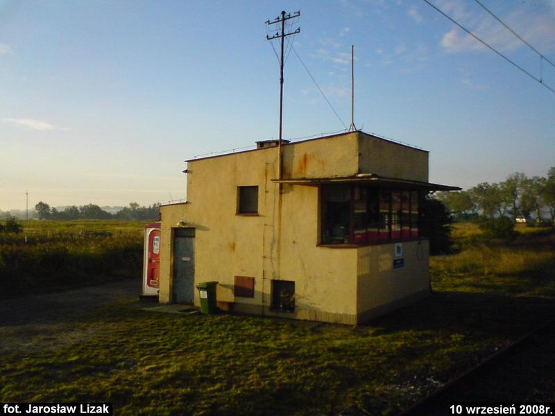 Dawna nastawnia dysponująca Rt, na południowej głowicy stacji i strażnica przejazdowa na przecięciu z DK 3. Pomiędzy budynkiem a obecnym torem szlakowym był tor główny, dodatkowy. Budynek stoi teraz pusty. Widok w kierunku północnym (peron, Lubin).