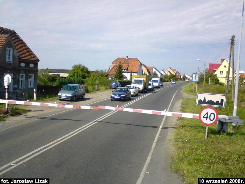 Przejazd kolejowy z DK 3 na wjeździe od strony Legnicy. W tle dawna nastawnia dysponująca Rt, obecnie strażnica przejazdowa. Widok w kierunku północnym (peron, Lubin).