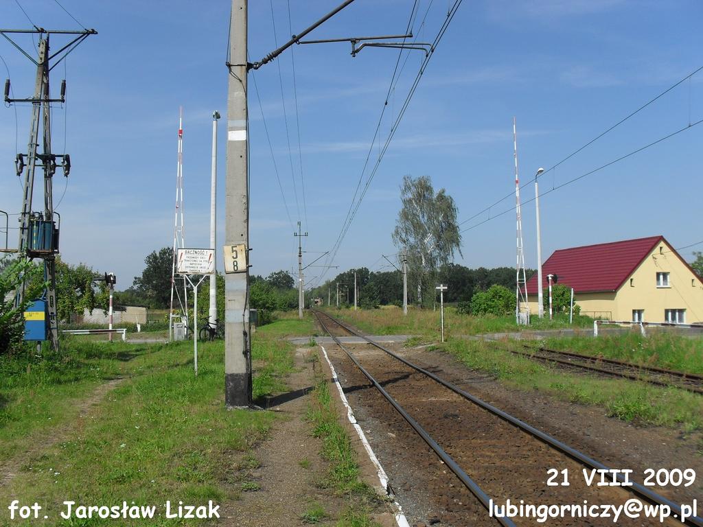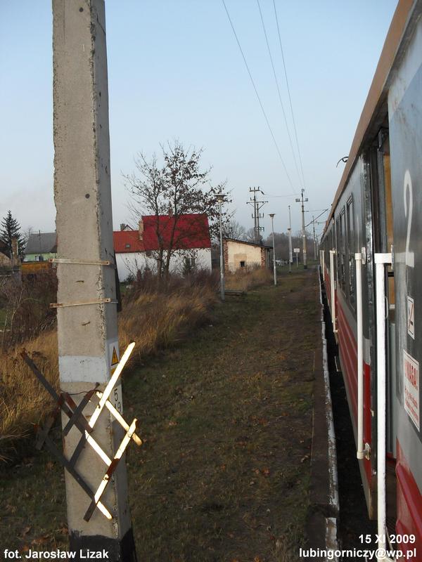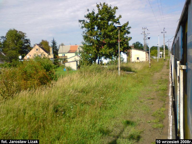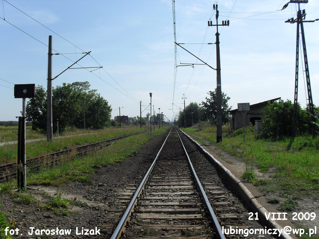 Wyjazd z przystanku w kierunku południowym (Legnica). Z lewej strony kadru ślad po rozebranym torze głównym, dodatkowym. W tle dawna nastawnia dysponująca, obecnie strażnica przejazdowa na przecięciu z DK 3.