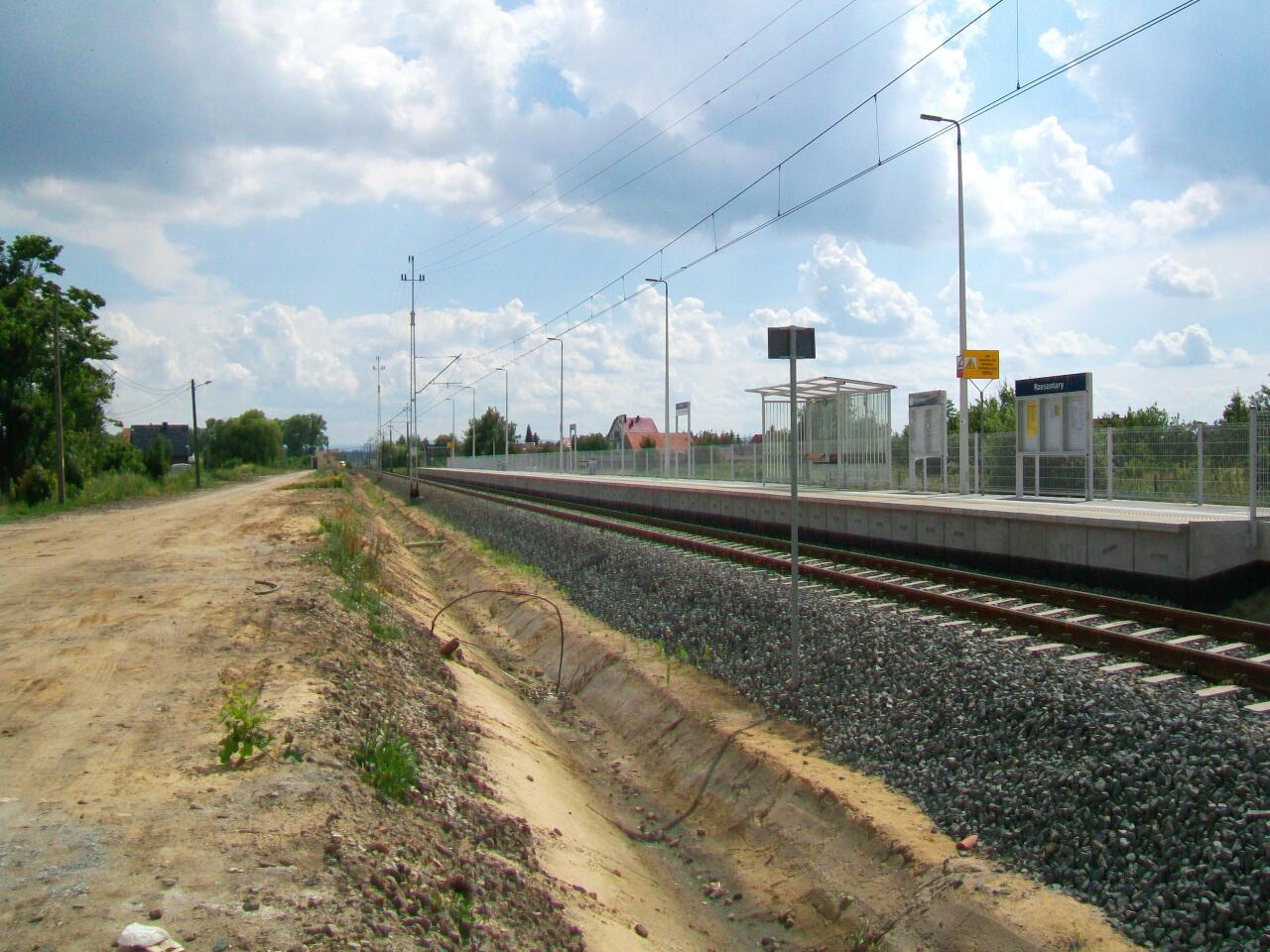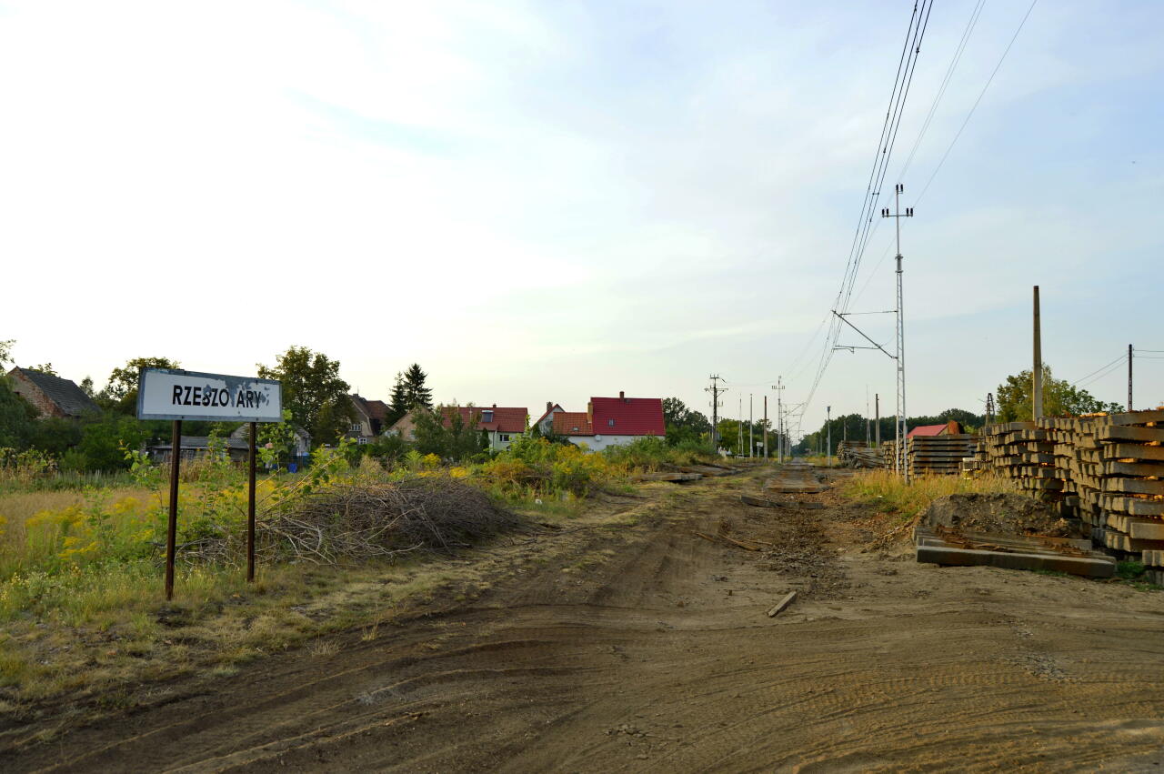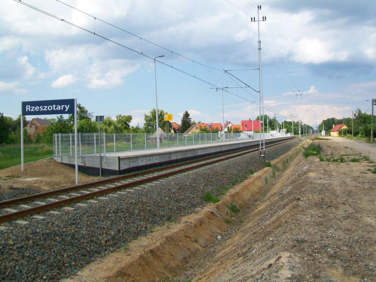 Widok na zmodernizowany peron w Rzeszotarach od strony wjazdu z Lubina. Z lewej strony ślad po rozebranym torze głównym, dodatkowym. Widok w kierunku południowym (Legnica).