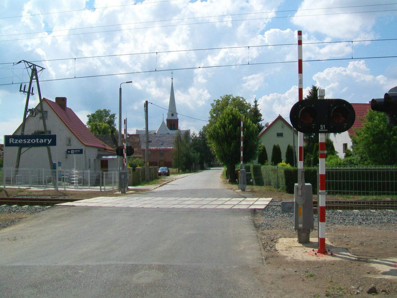 Przejazd kolejowy przez ul. Wiejską w Rzeszotarach. Z lewej strony wejście na peron. Widok w kierunku zachodnim (w lewo Legnica, w prawo Lubin).