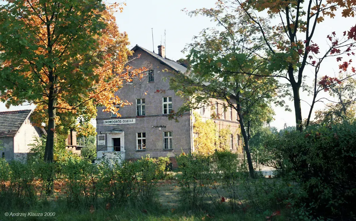 Widok z peronu stacji Nowogród Osiedle na budynek, w którym po rozebraniu oryginalnego dworca ulokowano niegdyś poczekalnię z kasą biletową oraz biuro zawiadowcy.