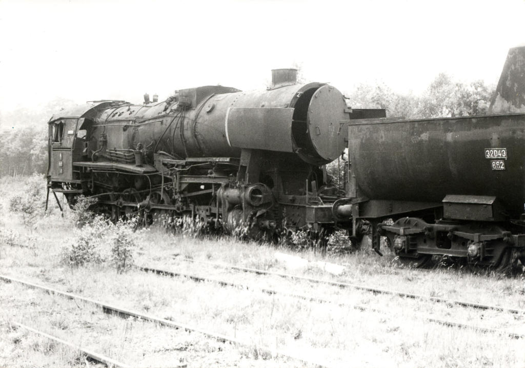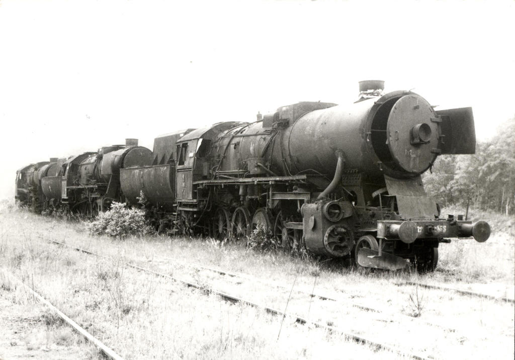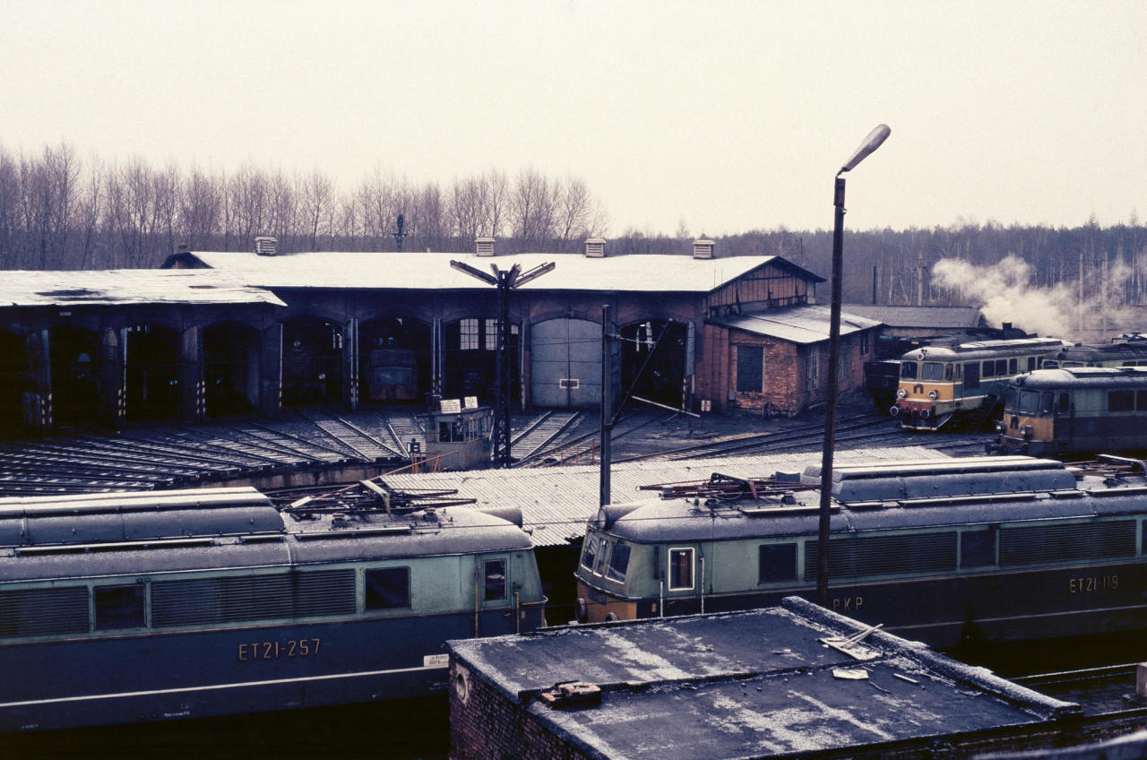 Unikatowe zdjęciu ukazujące obsadzony przez pojazdy trakcyjne wschodni wachlarz lokomotywowni w Węglińcu, której zabudowa znajduje się na wschodniej głowicy stacyjnej. Budynek ten obecnie nie istnieje. W tle widoczna wieża wodna oraz fragment wachlarza zachodniego (dach z naświetlami), który stoi po dziś dzień ale jest już nieużywany. Widok w kierunku północno-zachodnim, wjazdy od strony Lubania Śląskiego i Zebrzydowej/Bolesławca.
