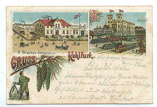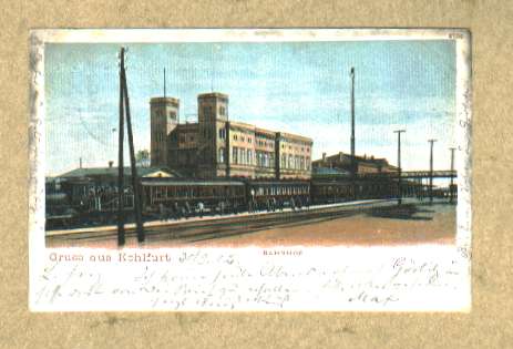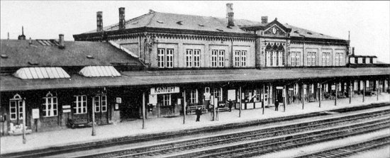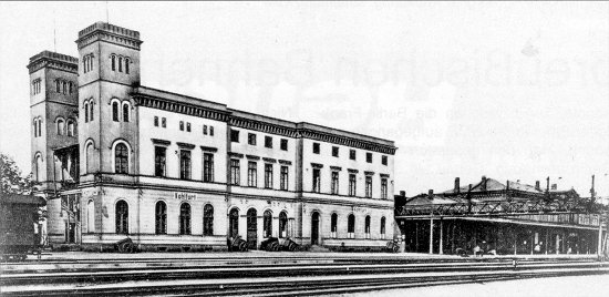 W lewym górnym rogu - budynki dworców; z lewej (jasny, z wieżami) starszy, z prawej (czerwony, niższy) młodszy.