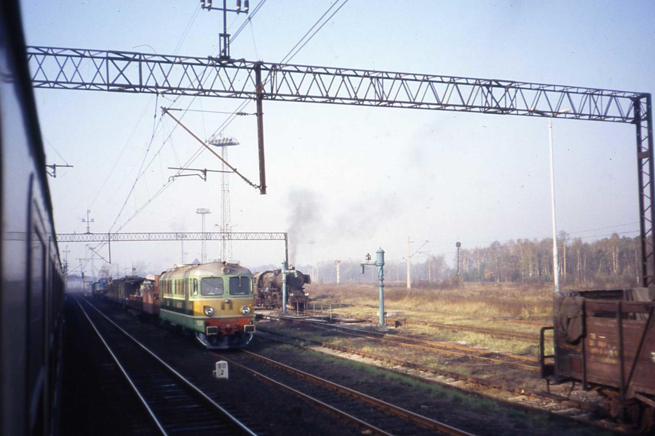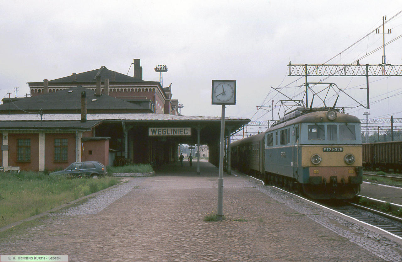 ET21 z dwoma wagonami klasy 2 (ryflaki lub bonanzy) był etatowym składem w relacji Węgliniec - Jelenia Góra przed pojawieniem się autobusów szynowych. Młodszy budynek dworcowy był jeszcze zagospodarowany (Straż Graniczna, poczekalnia, bufet, gniazdo drużyn konduktorskich). Widok z peronu 2 w kierunku zachodnim (Zgorzelec, Horka, Ruszów).