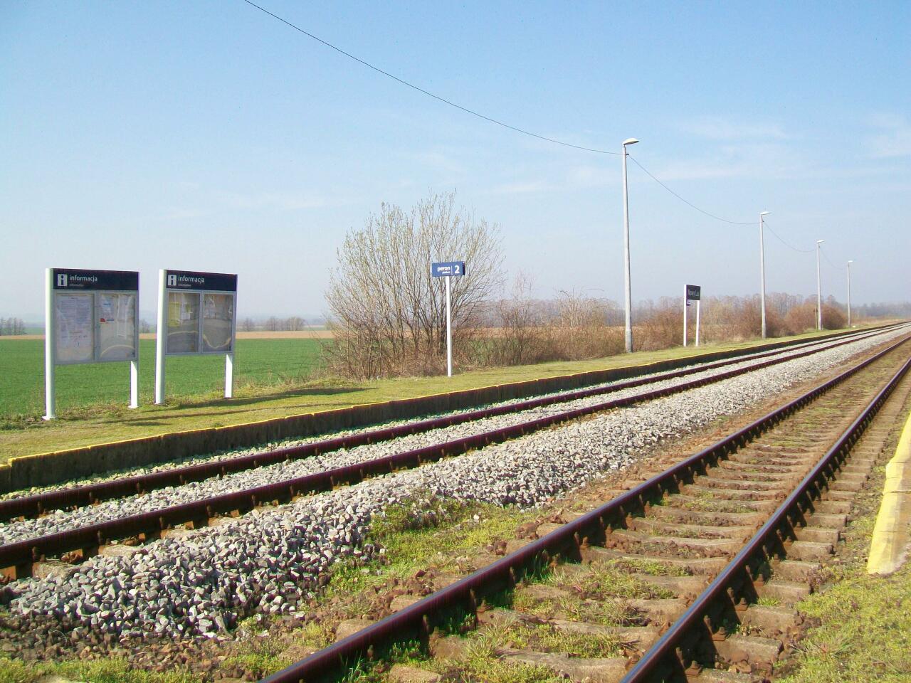 Opis infrastruktury: 2 perony boczne jednokrawędziowe; nawierzchnia ziemna, krawędź z płyt betonowych. Oświetlenie elektryczne. Przejazd kategorii D na drodze gruntowej. (info: Przemysław Więcek, 05-07-2010) Opis budynków: Parterowy budynek z 1960 r. Mały parterowy budynek z dwuspadowym dachem. (info: Przemysław Więcek, 05-07-2010) |