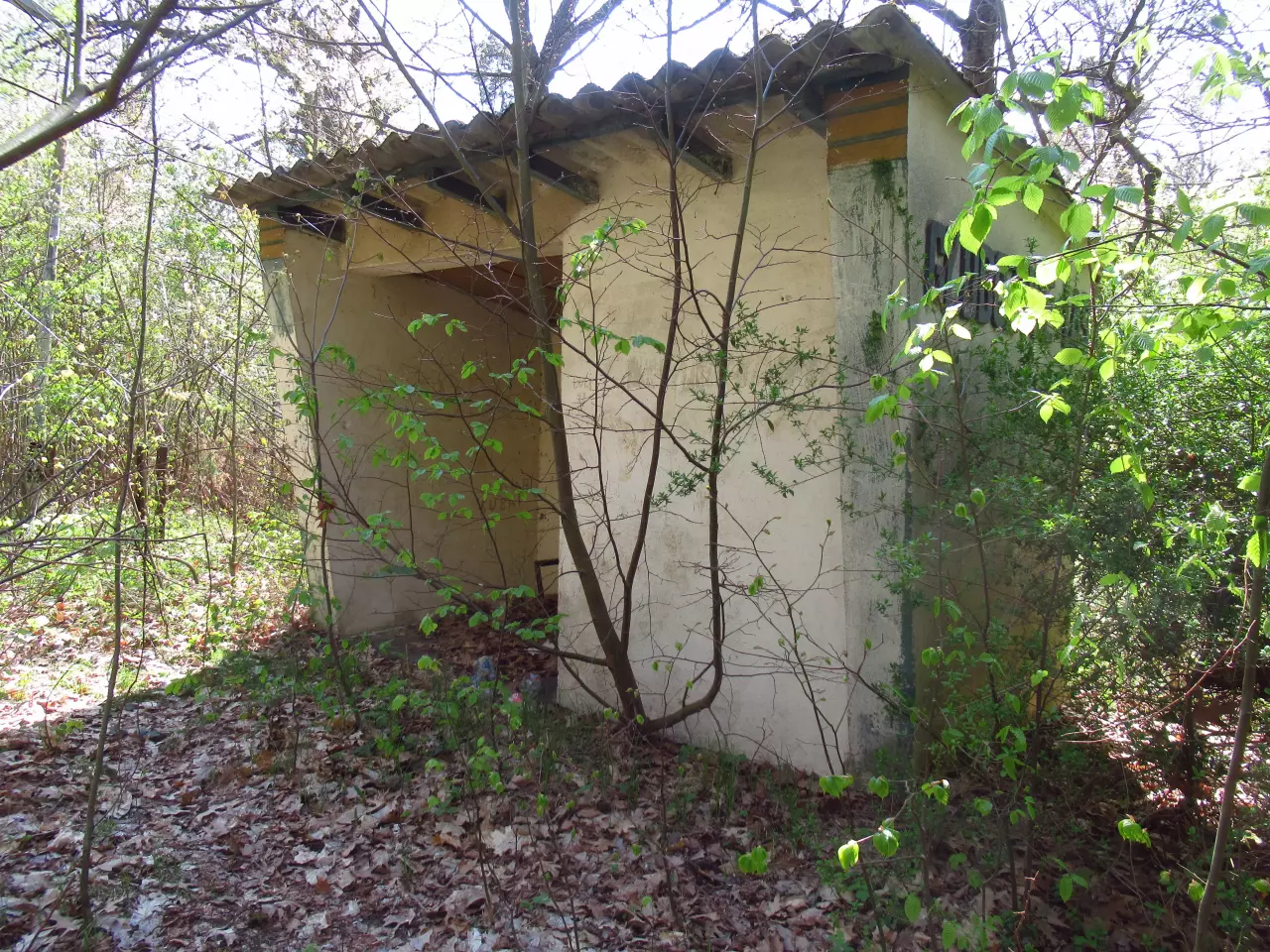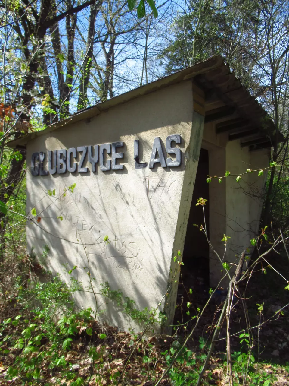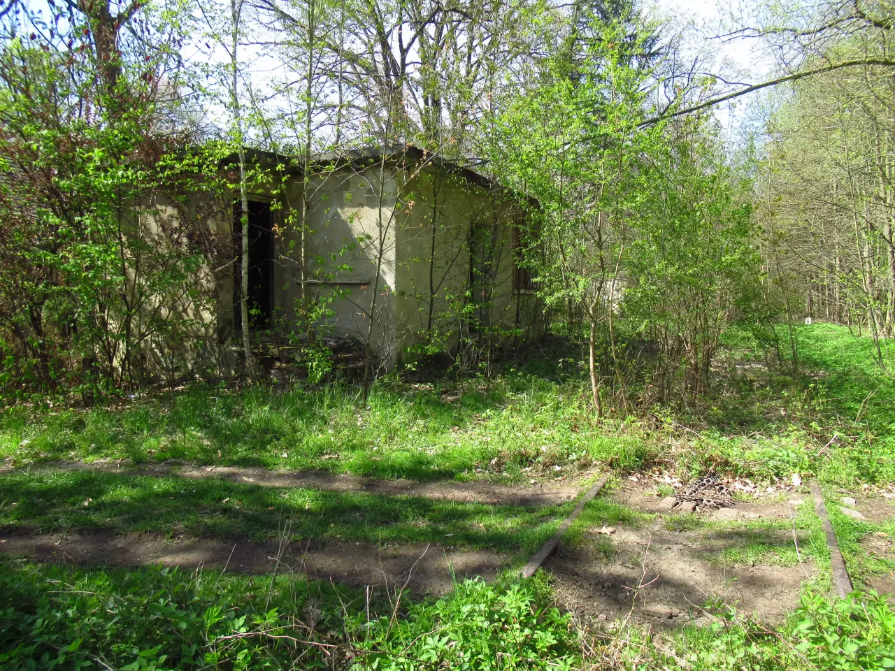 Głubczyce Las - toalety oraz dawny budynek mieszkalny. W prawo znajduje się zarośnięty peron. Kierunek północny.