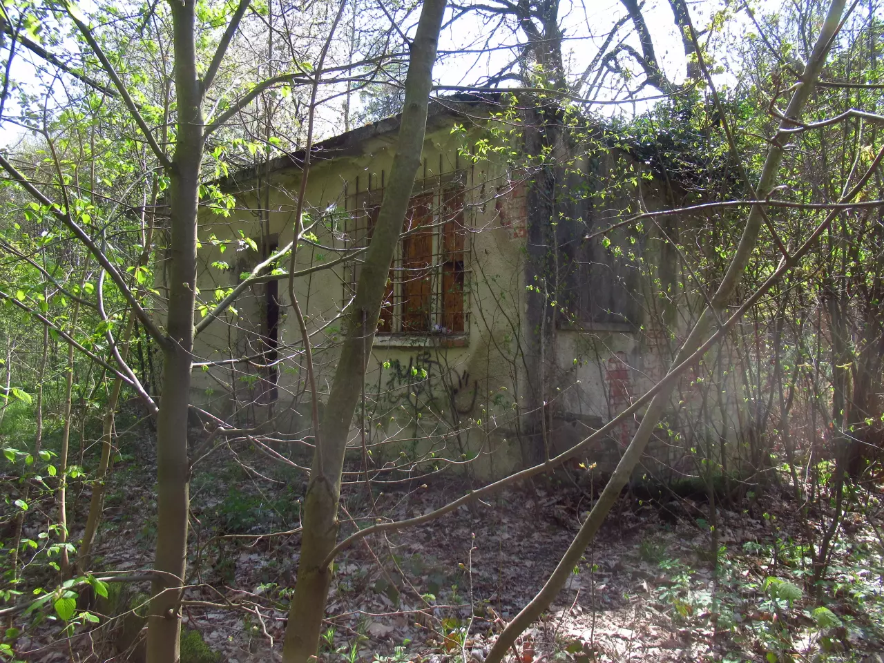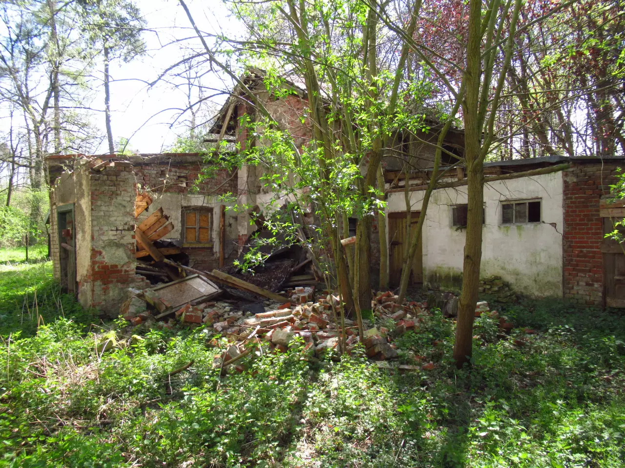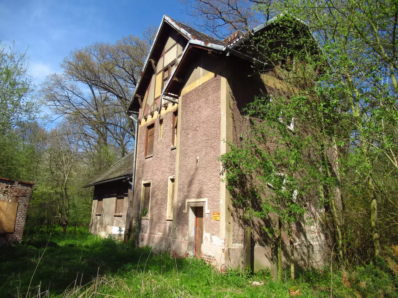Opuszczony budynek mieszkalny. Z prawej, poza kadrem, opuszczony dworzec i peron. Kierunek północno-wschodni.