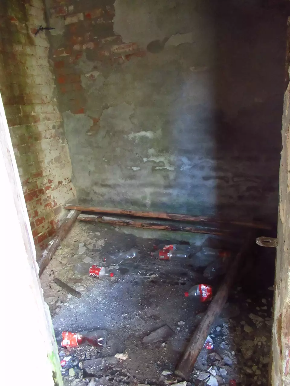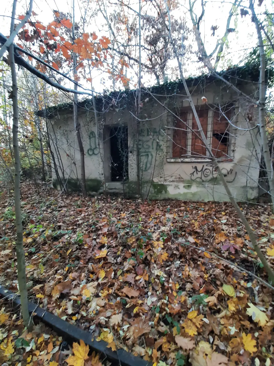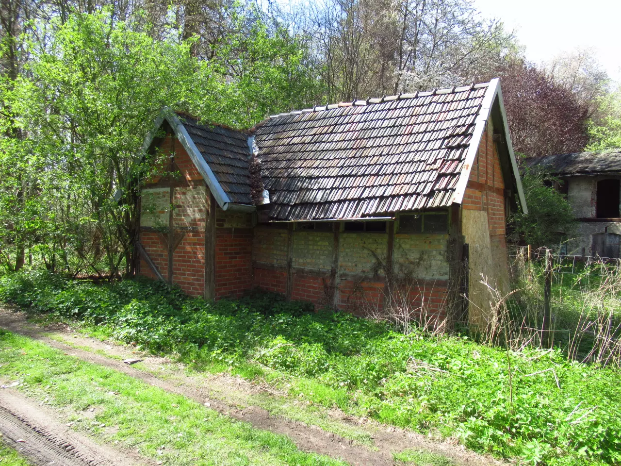 Opuszczony budynek mieszkalny. Z prawej, poza kadrem, opuszczony dworzec i peron. Kierunek północno-wschodni.