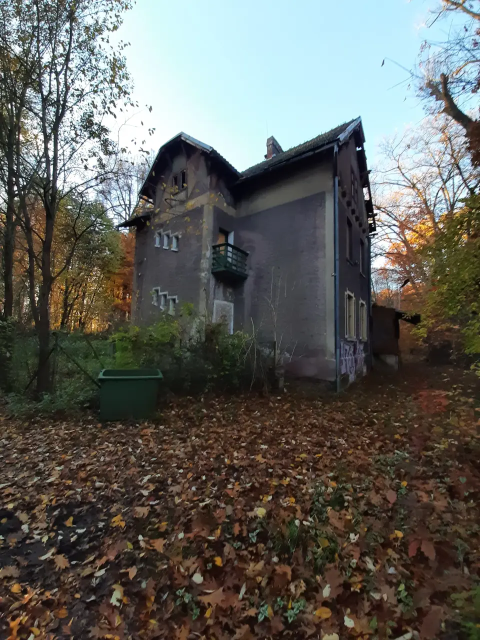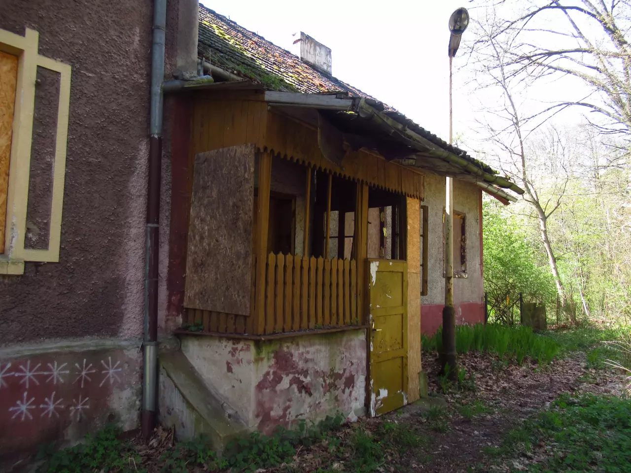 Opuszczony budynek mieszkalny. Z lewej, poza kadrem, opuszczony dworzec i peron. Kierunek południowo-wschodni.