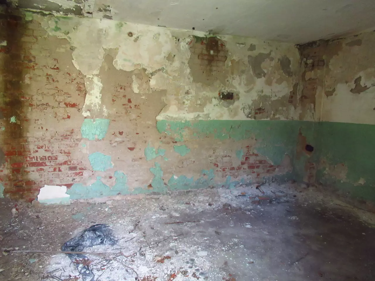 Opuszczony budynek mieszkalny. Z prawej, poza kadrem, opuszczony dworzec i peron. Kierunek północno-zachodni.