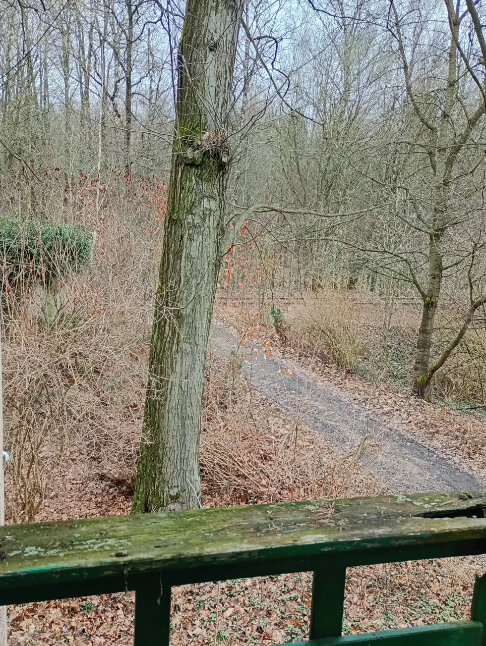 Widok z balkoniku w dawnym budynku mieszkalnym na torowisko przy przystanku Głubczyce Las. W lewo Racławice Śląskie, w prawo stacja Głubczyce/Racibórz.
