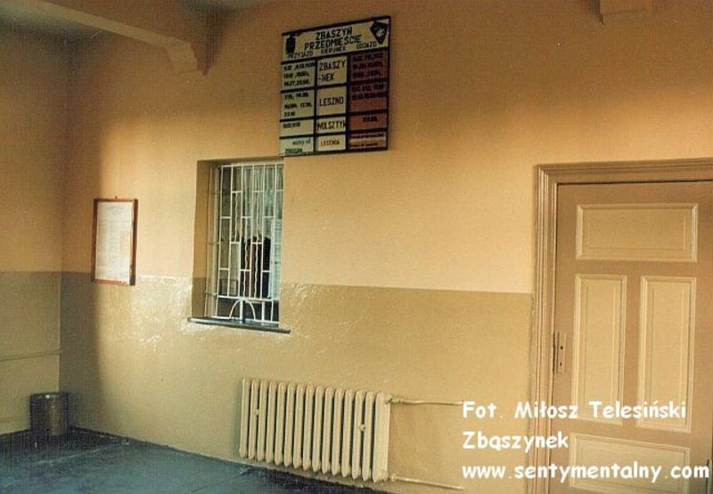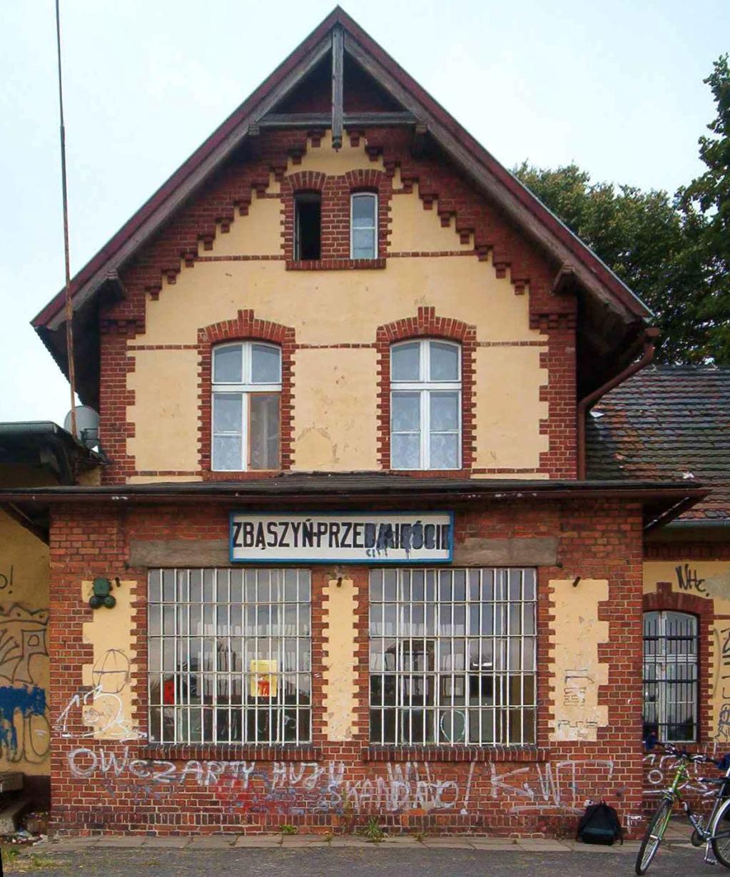 Budynek dworcowy od strony peronu. Po lewej magazyn. W lewo Wolsztyn, w prawo stacja Zbąszyń; 66,6 km.