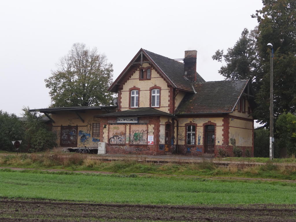 Dworzec kolejowy od strony peronu. Na dole przybudówka, w której była nastawnia. W lewo Wolsztyn, w prawo stacja Zbąszyń