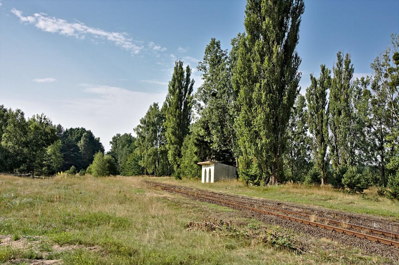 Dlaczego napisano, że budynków nie było? W miejscu tej szpetnej betonowej wiaty, na tym samym fundamencie stała piękna drewniana wiata (podobna do tej z p.o. Bukowo k/Kluczborka). Natomiast po lewej obok stały murowane "muszlostaty".