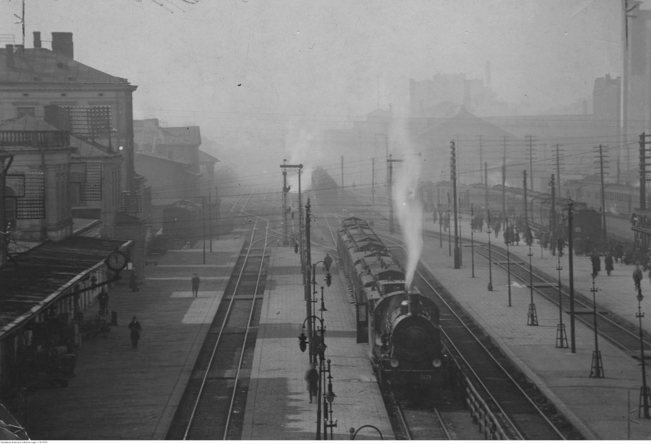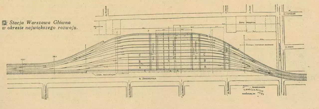 Wyjazd z Warszawy Głównej w kierunku zachodnim w czasie budowy linii średnicowej. Miejsce zrobienia fotografii to okolice obecnej ul. Emilii Plater przy Dworcu Centralnym. Widoczna z lewej duża kamienica to Kamienica Burcharda, przy obecnym Rondzie Czterdziestolatka (po jego stronie południowo - zachodniej). Widać świetlne semafory wyjazdowe i w oddali - kształtowe wjazdowe oraz dwie nastawnie. Zdjęcie z grupy FB Stara Warszawa na Fotografiach.