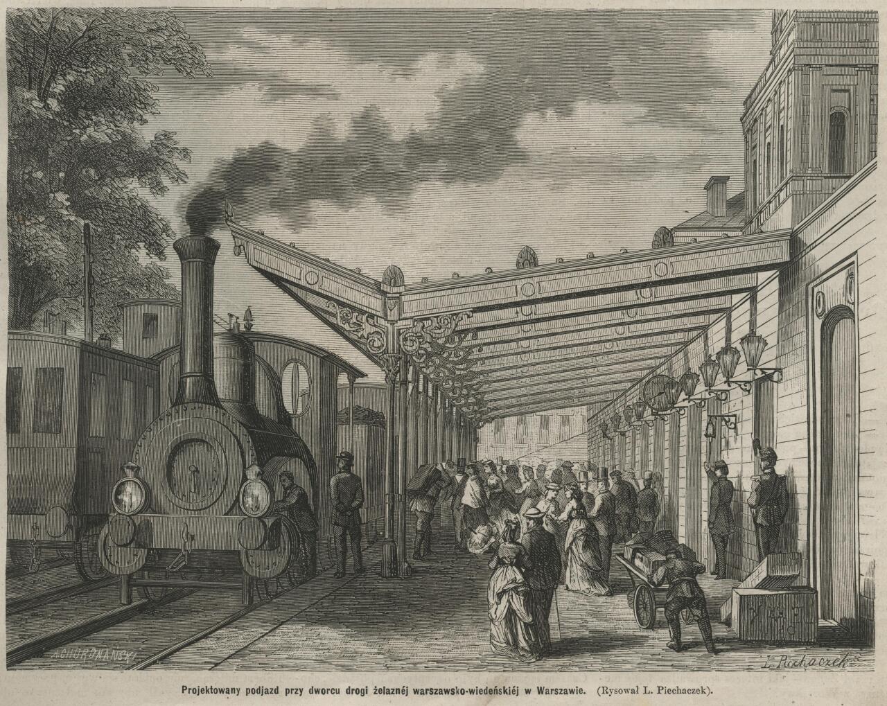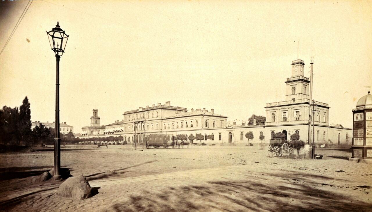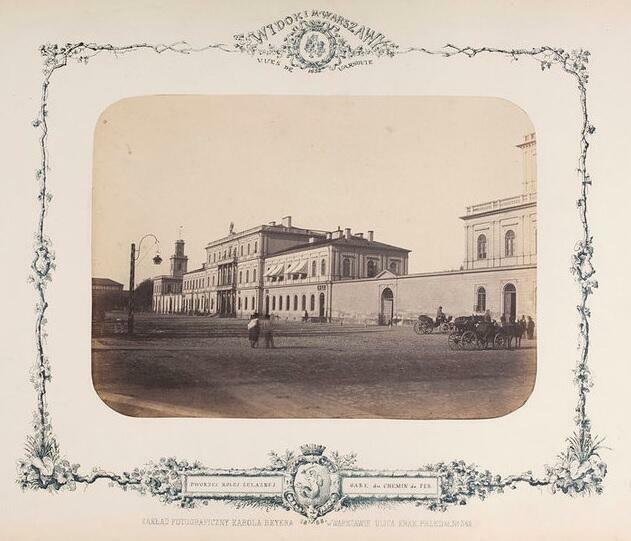 Dworzec Wiedeński w Warszawie, od strony podjazdu. Fotografia Karola Bayera (1818-1877). Odbitka z negatywu szklanego kolodionowego, obecnie w ekspozycji Muzeum Narodowego w Warszawie.