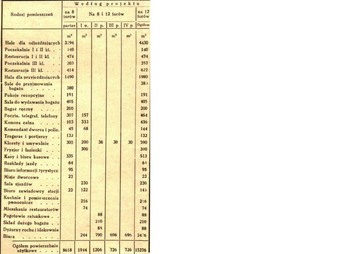 Jeden z proponowanych projektów dworca z roku 1931. Rodzaj i powierzchnia pomieszczeń w zależności od wyboru projektu na 8 lub 12 torów. Źródło "Inżynier Kolejowy" z lat 30 XXw.