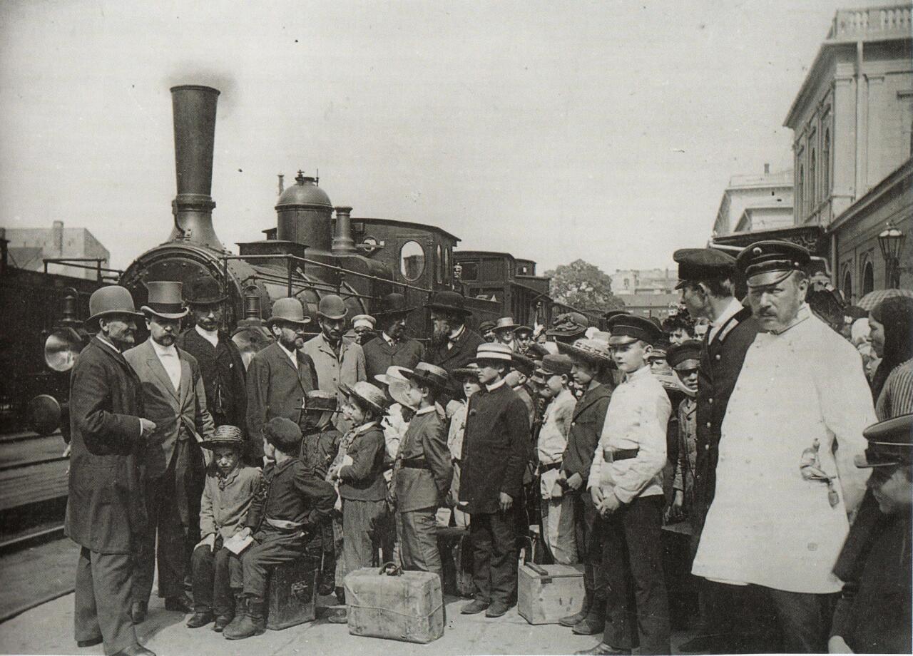 Grupa chłopców wyjeżdżających na kolonie letnie - 1892.