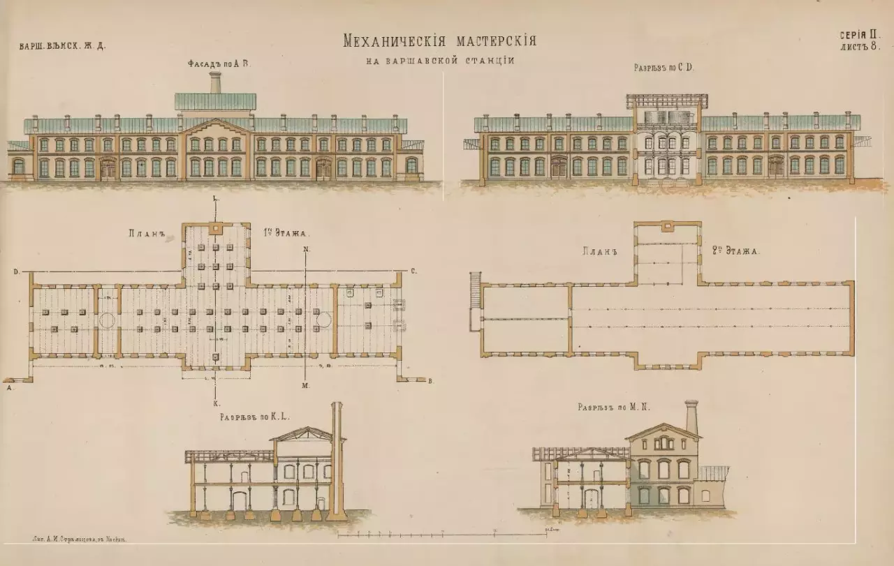 Warsztaty mechaniczne na warszawskiej stacji Drogi Żelaznej Warszawsko - Wiedeńskiej, litografia z 1872 r.