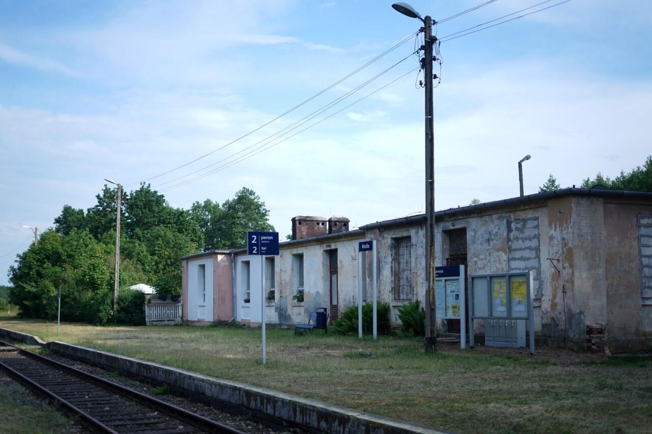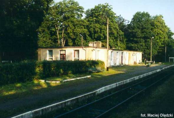 Widok na peron i budynek dworca od strony wjazdu z Rokitek.