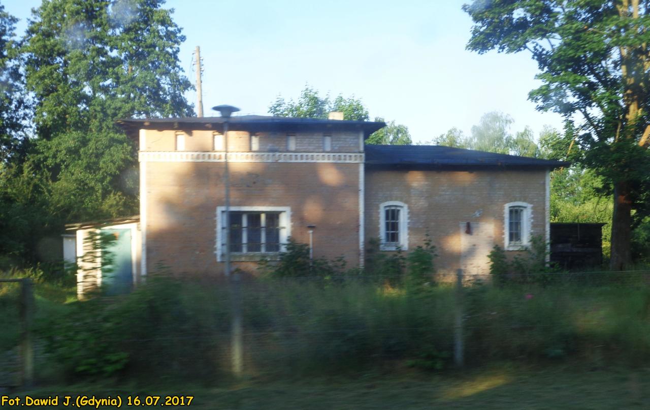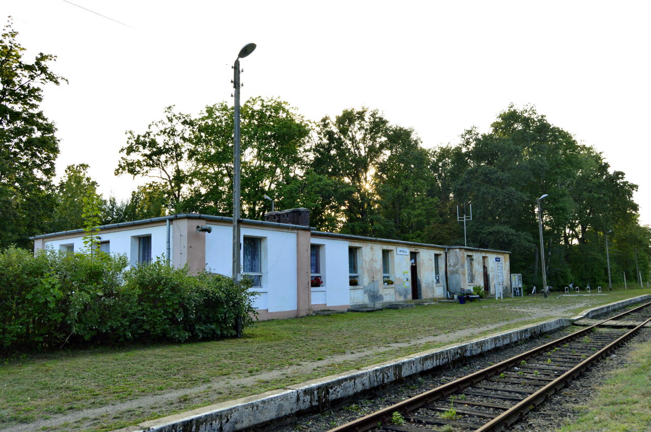 Budynek dworca, w którym mieściła się nastawni, od strony torów. Widok w kierunku Rokitek/Legnicy.