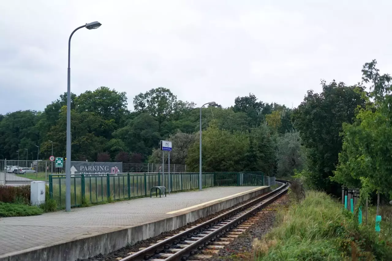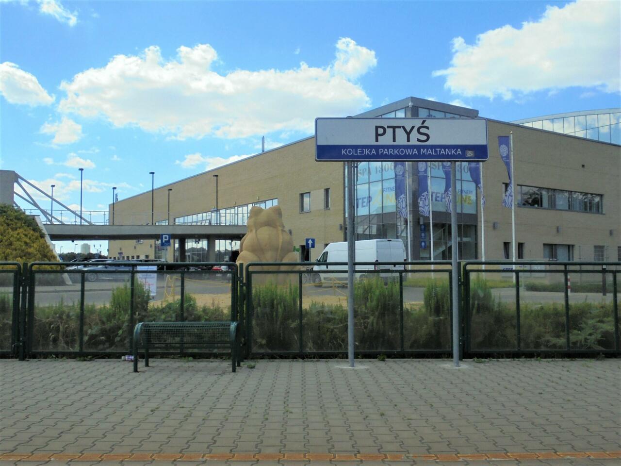 | Przystanek kolejki Maltanka przy Termach Maltańskich. Peron niski, odnowiony. Budynków brak. |