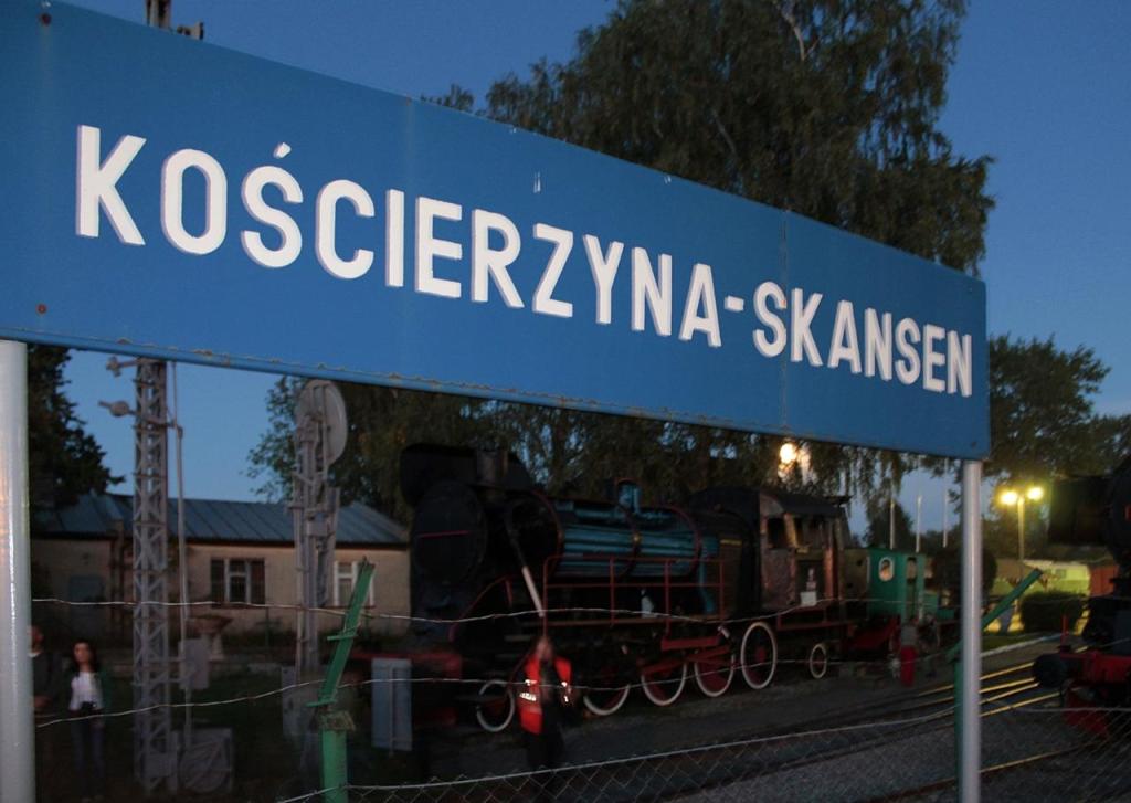 Kościerzyna. Widok na skansen, a w oddali budynek dworca.
