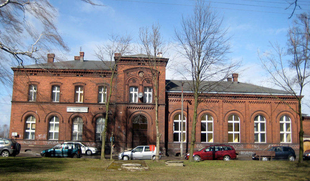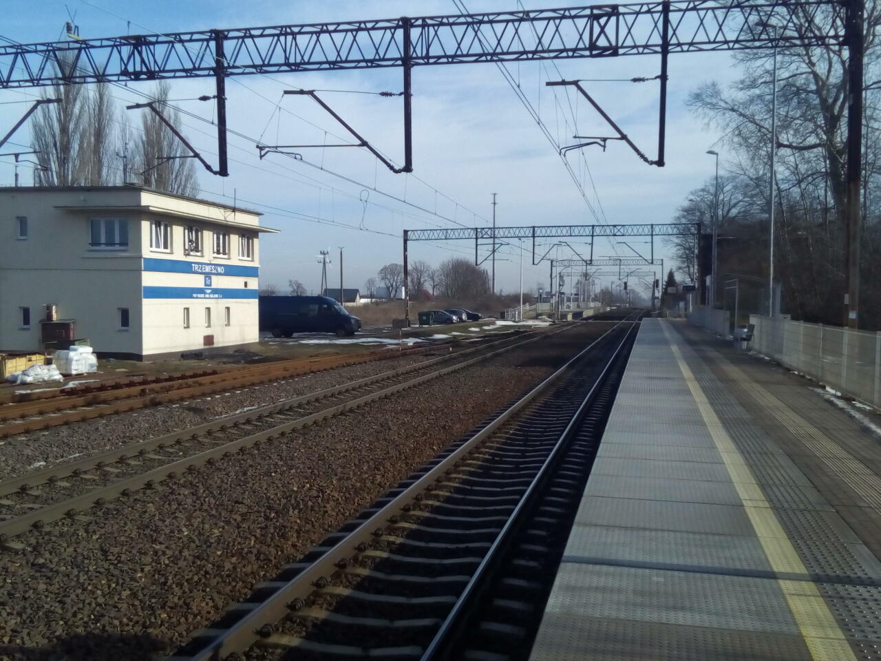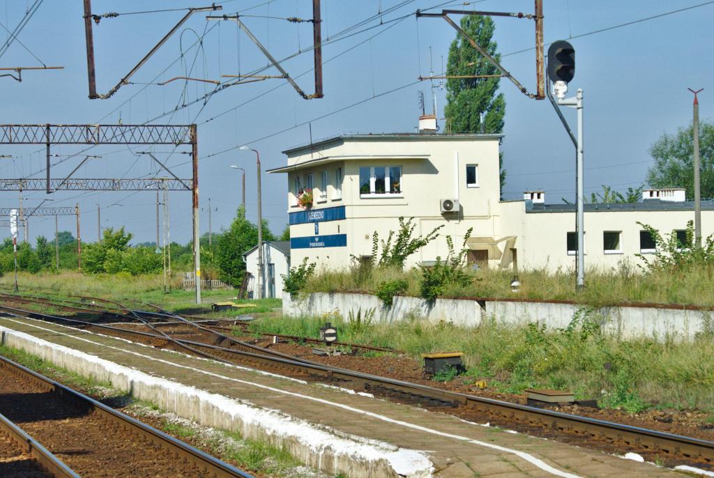 Kolejowy budynek mieszkalny (ul. Dworcowa 4) widoczny od strony torów. W lewo Mogilno, w prawo Gniezno/Poznań Główny.