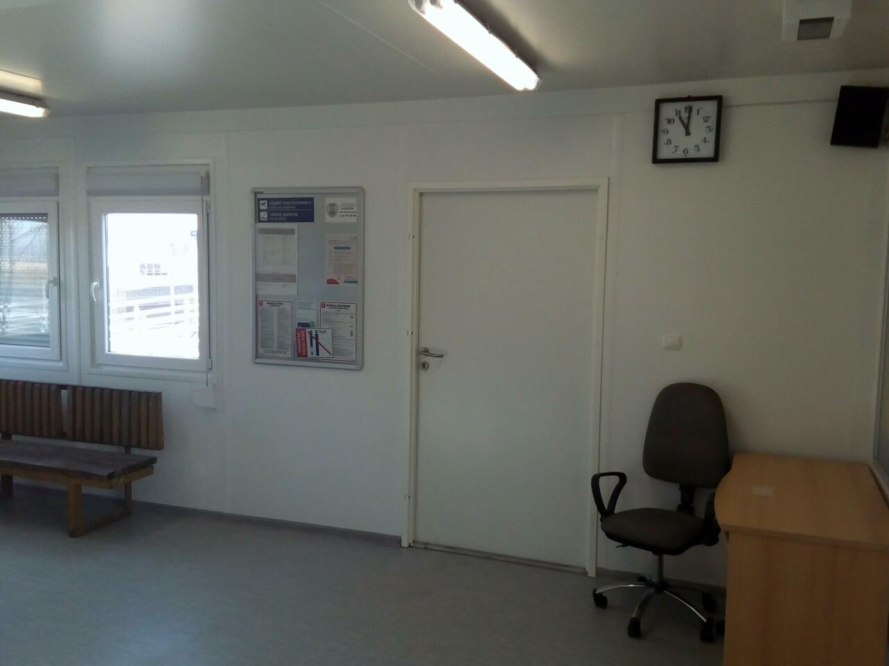 Tymczasowy kontener dla podróżnych na okres przebudowy budynku dworcowego. Poczekalnia.