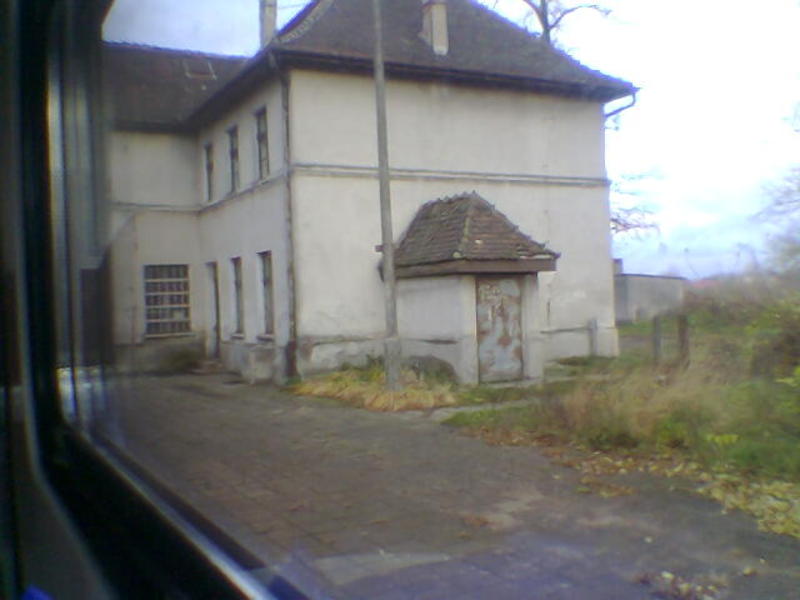 Zdjęcie przedstawia budynek dworca od strony peronu i wjazdu z Inowrocławia. Foto robione z pociągu. Budynek nieczynny.