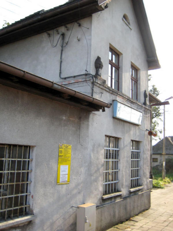 Wierzchosławice. Zamknięty budynek dworcowy od strony podjazdu.