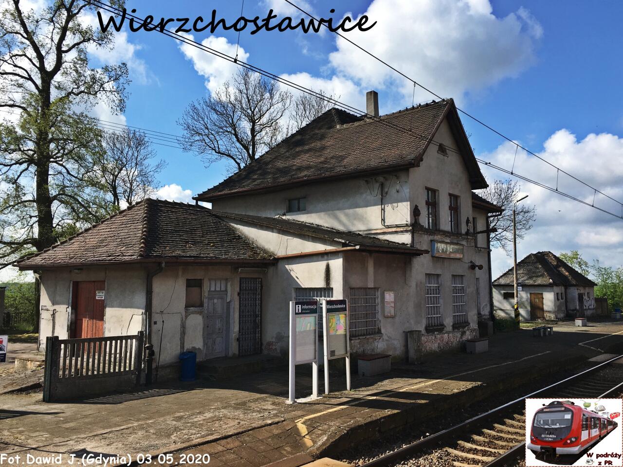 Dworzec Wierzchosławice wiosną. Godzina 18:40. Dworzec w pełnej okazałości, z przodu tory linii 353. W lewo Toruń, w prawo Inowrocław.
