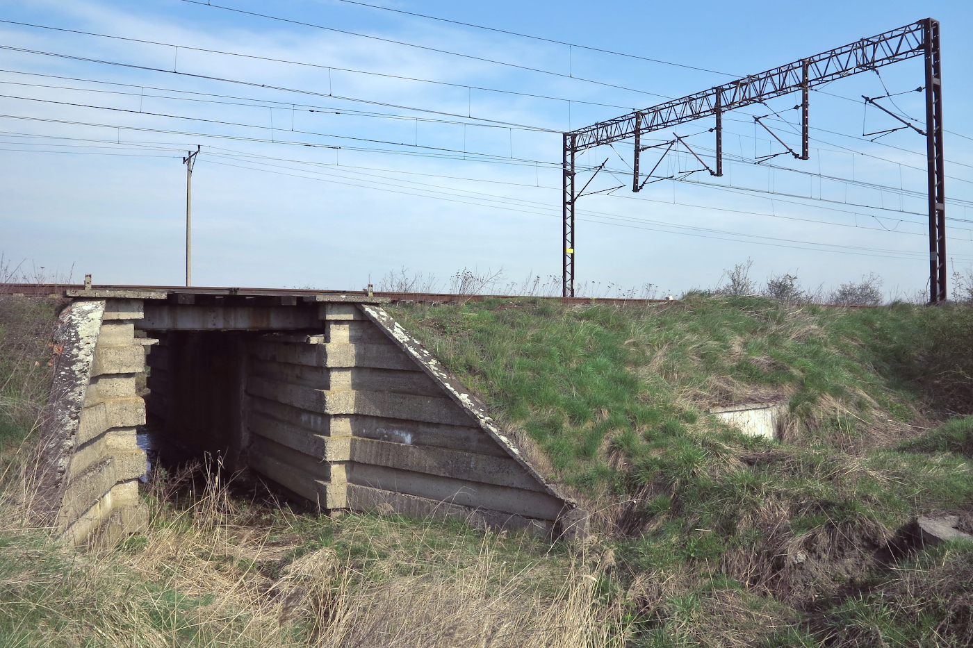 Część towarowa. Pod wiaduktem przebiegała linia wąskotorowa cukrowni Tuczno. W śladzie nieistniejącego toru rosną wysokie krzewy. Widok w kierunku Torunia.