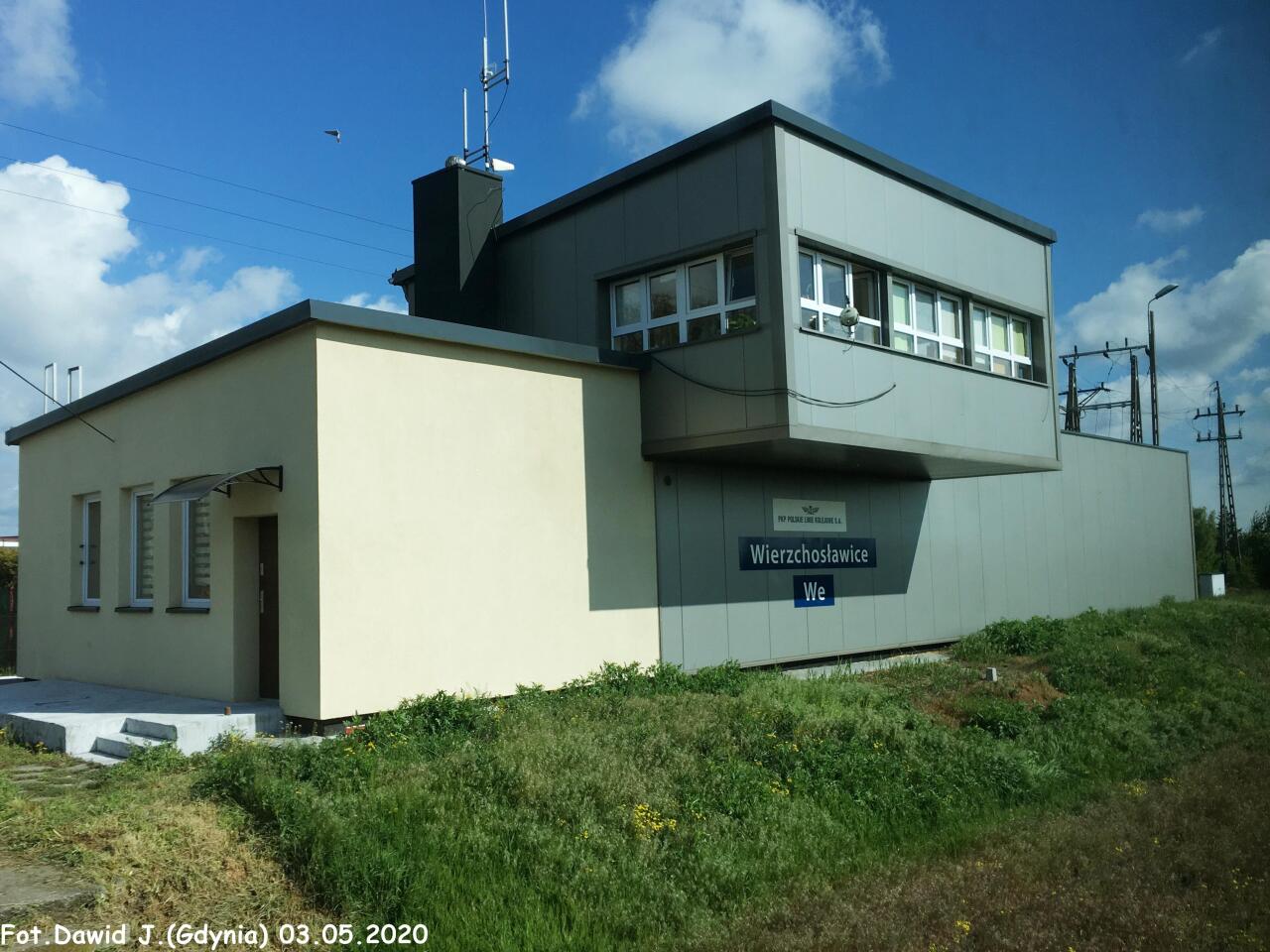 PKP Wierzchosławice. Budynek dworcowy. Widok od strony Torunia, z pociągu relacji Poznań Główny - Toruń Główny.