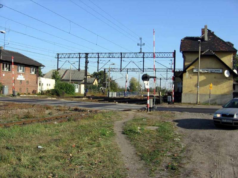 Widok na stację od południowego-zachodu (wjazd z Torunia). Przejazd kolejowy przez DW 552. Z lewej nastawnia dysponująca PT.