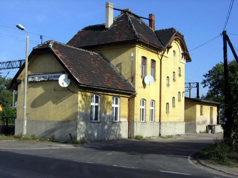 Budynek dworca kolejowego od strony torów. Na parterze przybudówka mieszcząca dawniej nastawnie dysponującą. Z lewej część magazynowa. W prawo Toruń Wschodni, w lewo Kowalewo Pomorskie.
