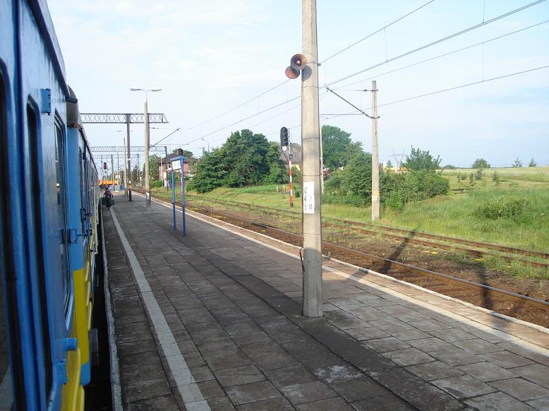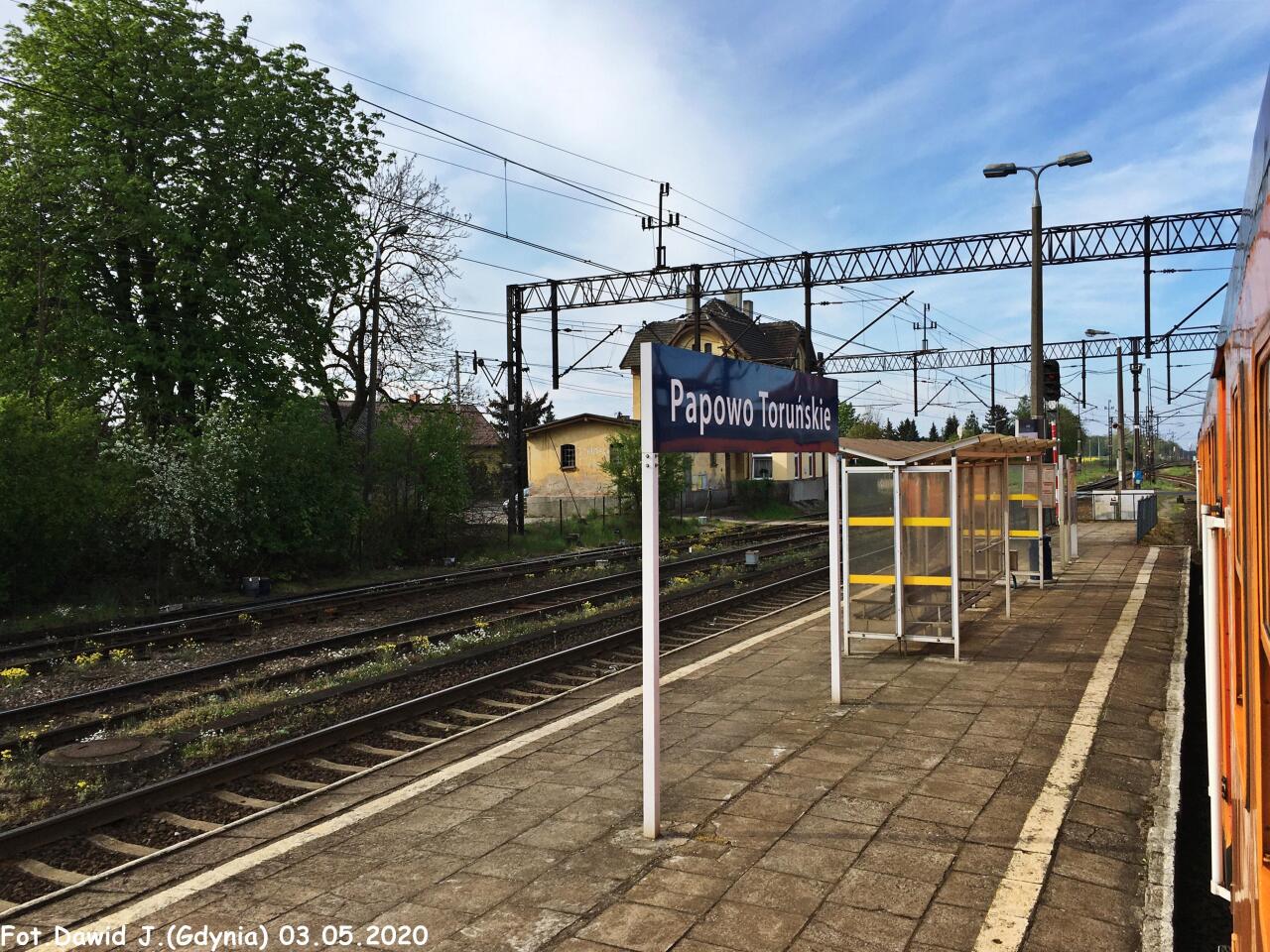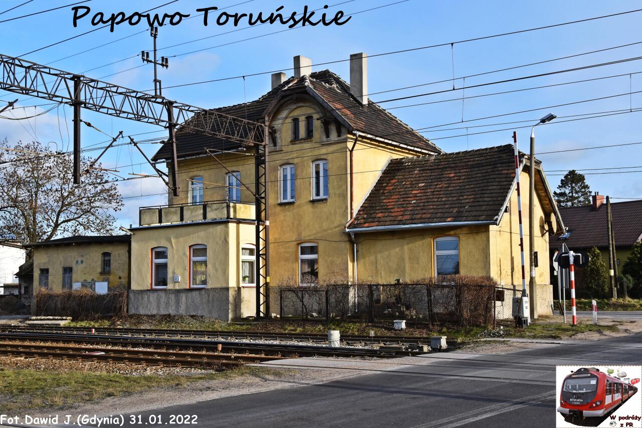 Widok na stacje w Papowie Toruńskim z przejazdu kolejowego na drodze krajowej nr 552, od strony wjazdu z Torunia.