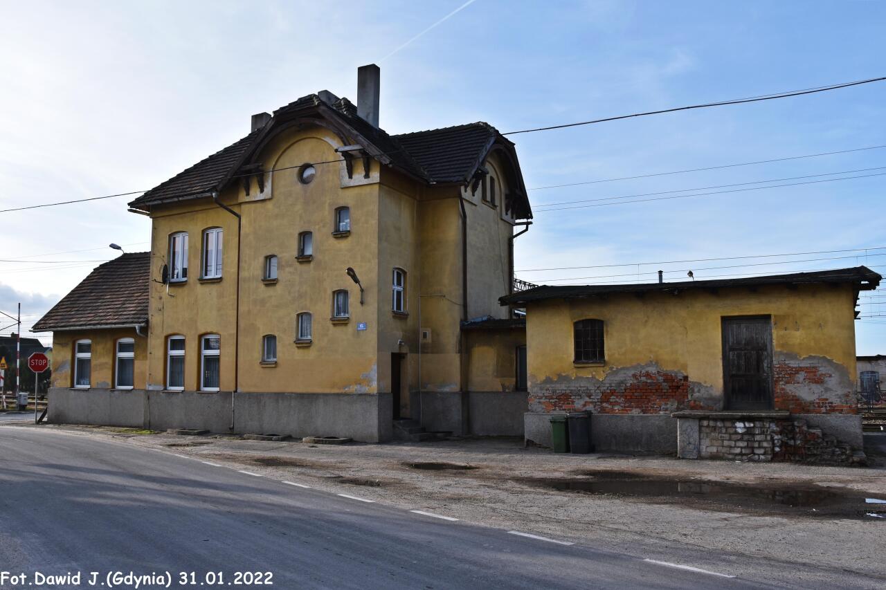 Budynek dworca od strony ulicy. Widok w kierunku Kowalewa Pomorskiego.