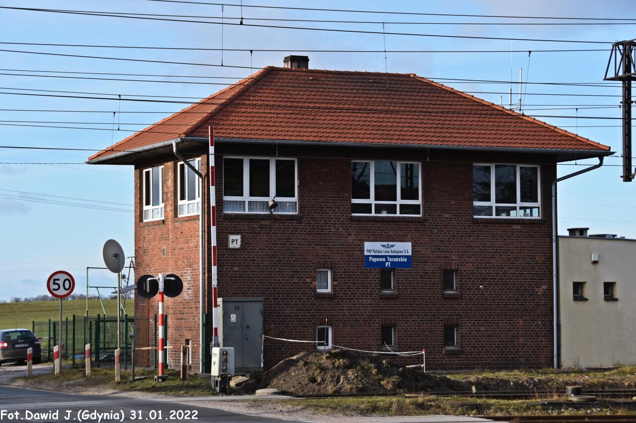 Budynek nastawni "PT" widoczny od strony torów. W lewo Toruń Wschodni, w prawo Kowalewo Pomorskie/Iława Główna.