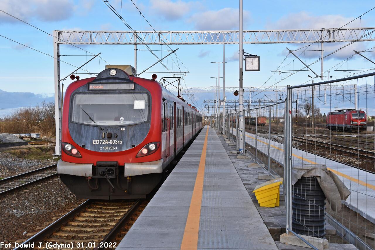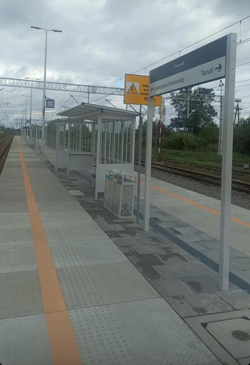Widok ze zmodernizowanego peronu w kierunku Kowalewa Pomorskiego/Iławy Głównej. Pociąg ED72A-003 realizujący kurs PR z Torunia Głównego do Jabłonowa Pomorskiego, oczekuje przy peronie.