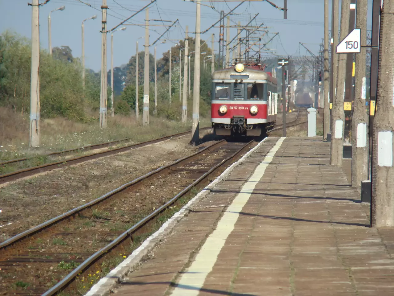 Papowo Toruńskie. EN57-1314 - pociąg do Poznania Głównego. Widok w kierunku Inowrocławia/Poznania.