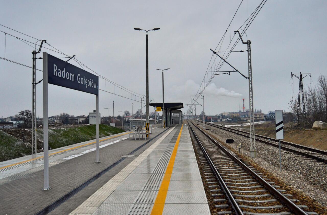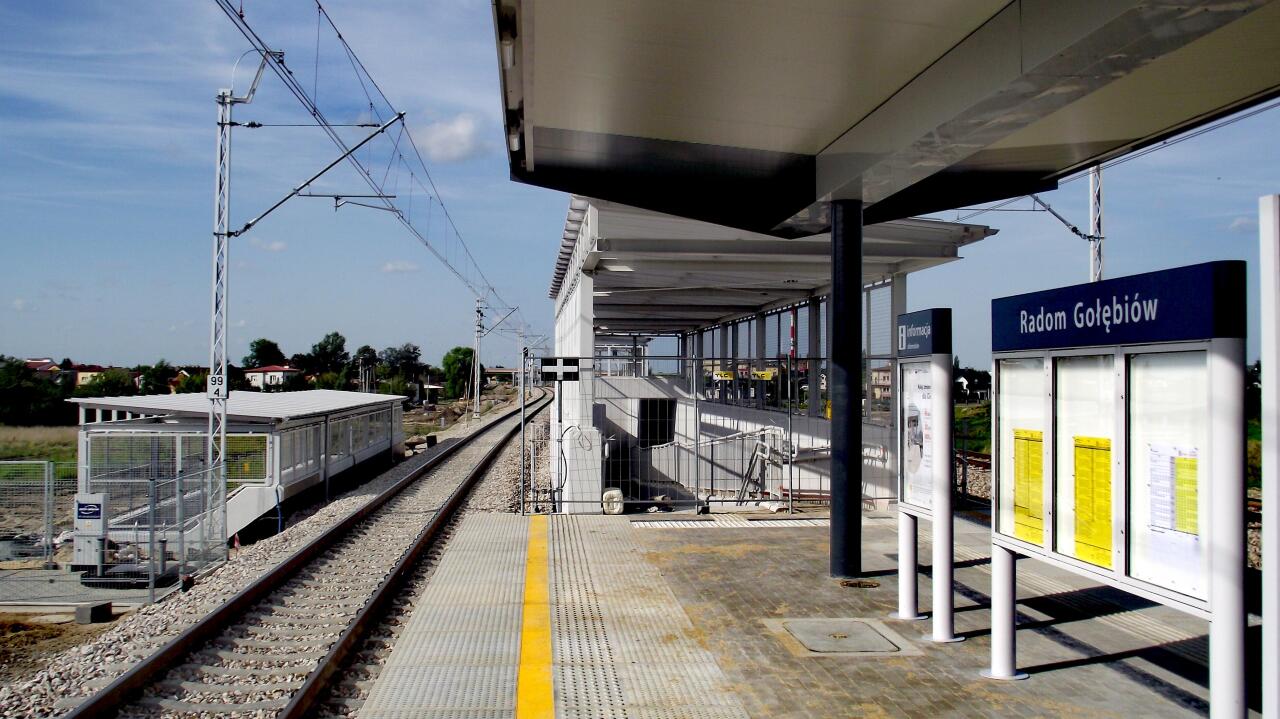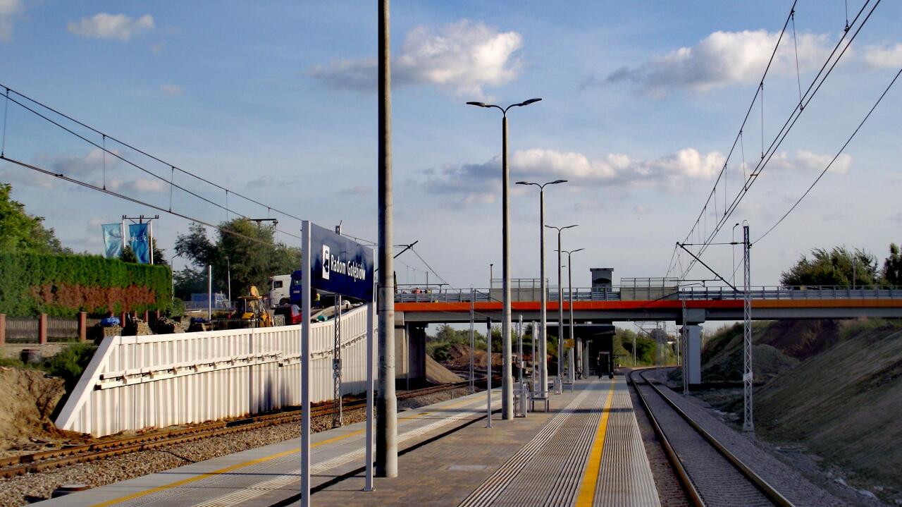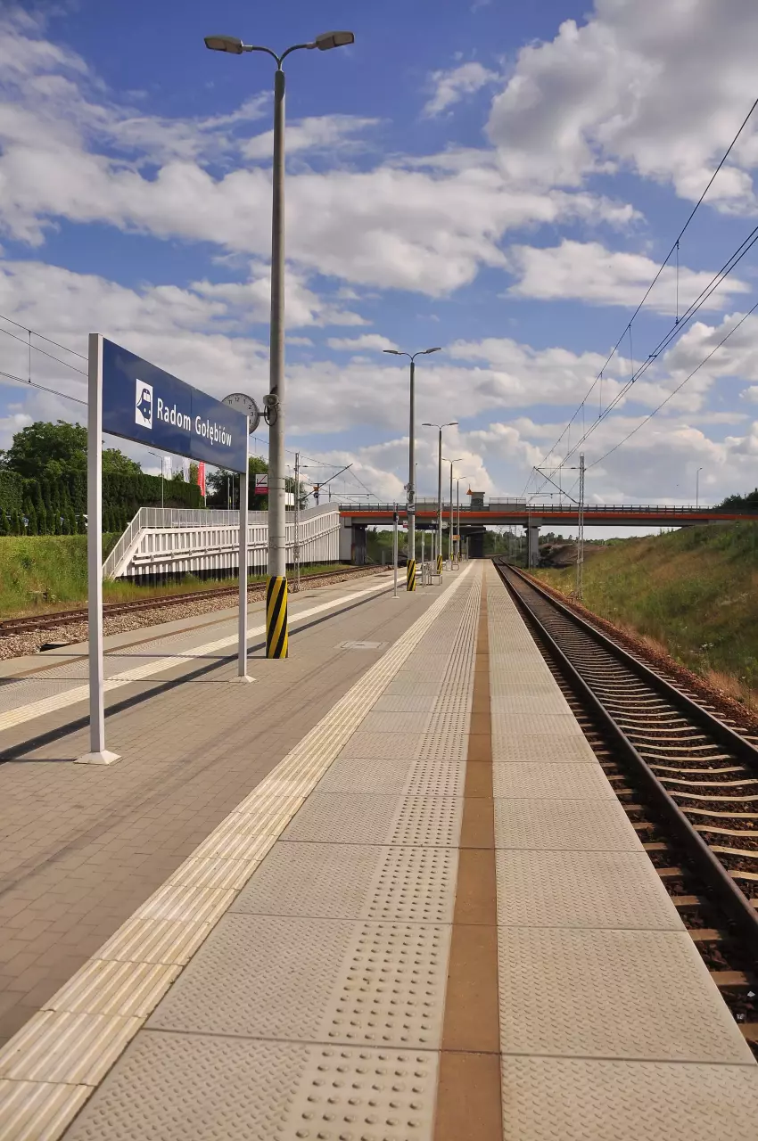 Peron, widok w kierunku stacji Radom. Górą wiadukt w ciągu ul. Struga.